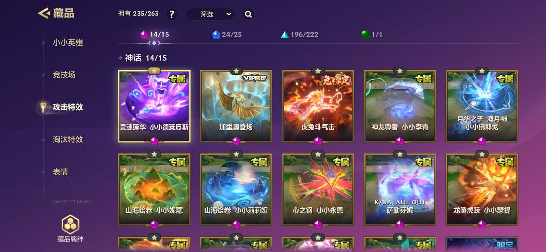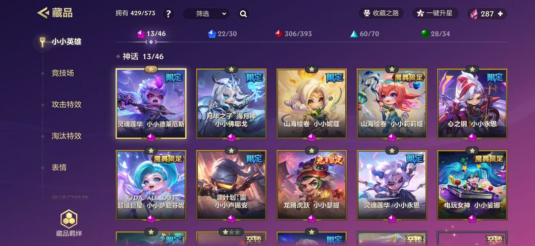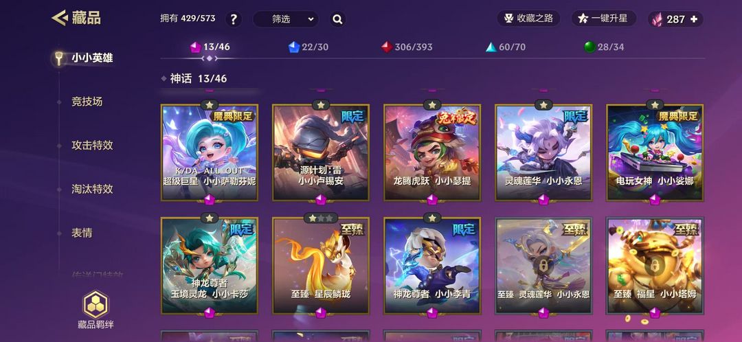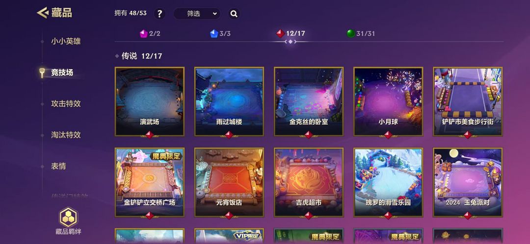装备描述:小小英雄:KDA萨勒芬妮,源计划卢锡安,龙腾虎跃瑟提,灵魂莲华永恩,灵魂莲华德莱厄斯,心之钢永恩,山海绘卷妮蔻,山海绘卷莉莉娅,电玩女神娑娜,神龙尊者卡莎,神龙尊者李青,至臻玲珑 竞技场:灵魂莲华世皆如梦 神龙之巅 魄罗水上乐园 全球 总决赛百炼成 金演武场 雨过城楼 金克斯的卧室 小月球 铲铲市美食步行街 金铲铲立交广场 元宵饭店 吉虎超市 魄罗的滑雪场 玉兔派对 竹林禅院 德玛西亚团结圣坛