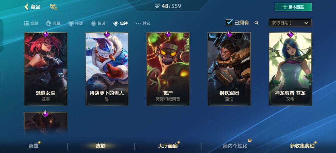 装备描述:亚索黑夜使者 灵魂莲华 诺手西部魔影 女警的兔年限定等等