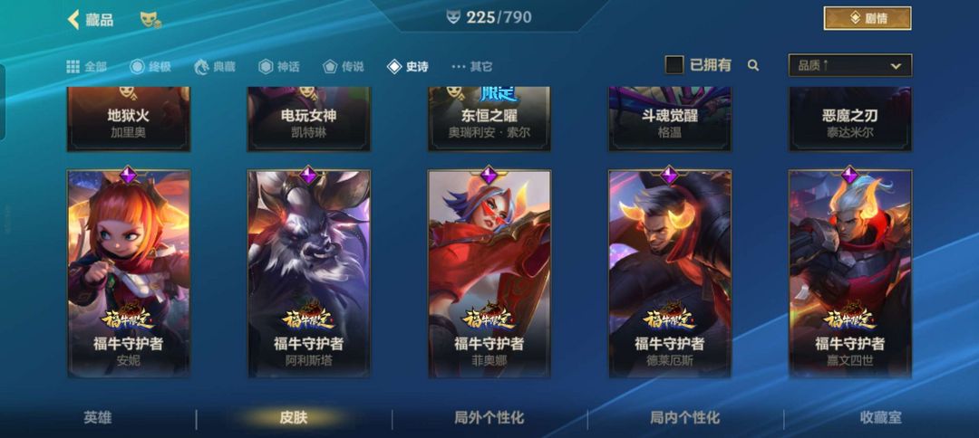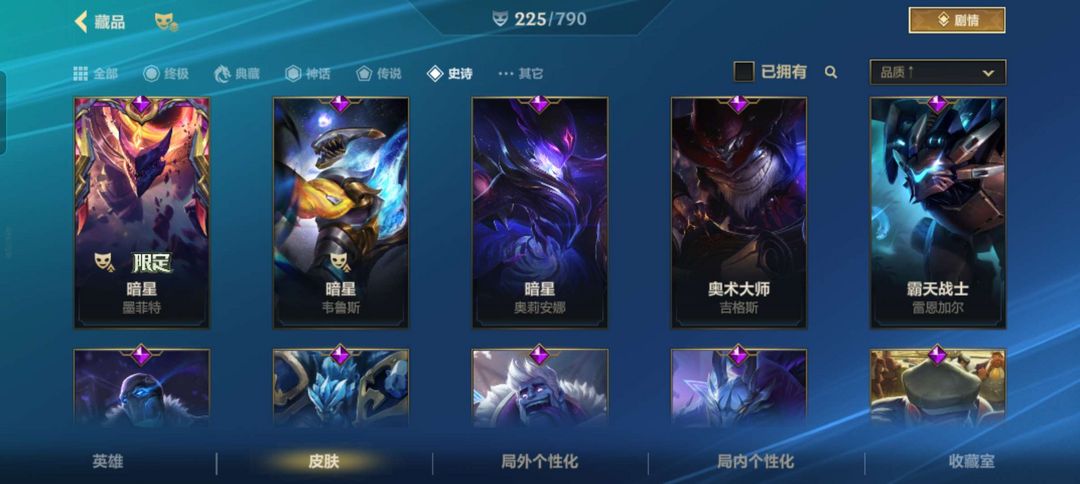 228个皮肤,82个史诗皮肤,16个传说皮肤,可打排位,5级信誉分。