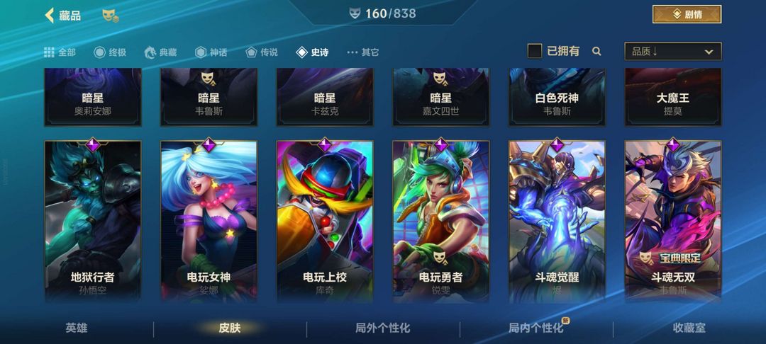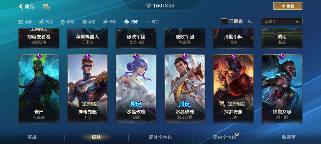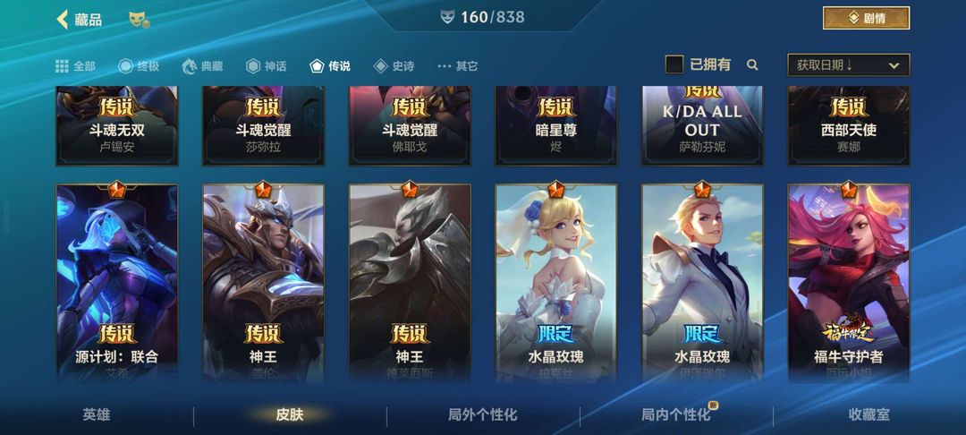 全英雄160皮含传说限定,水晶玫瑰/斗魂/暗星多系列,可排位可娱乐