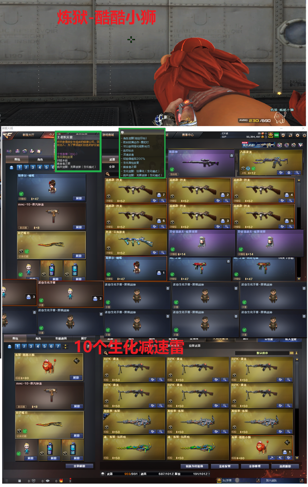 装备描述:排位:可以.................两把清道夫-小人枪无限卡子弹、生化全装(可以变更背包、可以查看生化僵尸血量):无需换弹、6烈6盘3炼狱、炼狱酷酷小狮、死亡之眼、斯太尔-蝴蝶、清道夫-小人枪、八面凌龙、双面神、MAC-涂鸦、炽芒蝶刃、10个生化减速雷、超级对讲机、、、、、、爆破四防:幻神电流骇客皮肤、USP手枪、柯尔特竞技荣光、玄豹白虎、白虎、、、毁灭音效、雷神音效、极光音效、黑骑士音效、、、4套雷霆、2套玄豹、4套竞技荣光手雷、、、、。、生化四防(隼、王者炽天使)、爆破四防(云悠悠。玄豹)