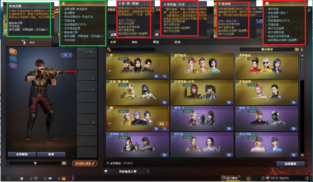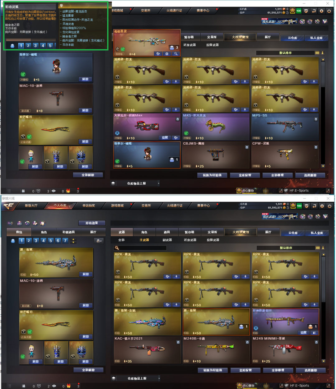 装备描述:排位:可以------------生化四防(生化背包、可以查看生化僵尸血量)无需换弹、6烈龙、6盘龙、炼狱、传说圣灵、斯泰尔蝴蝶、MK5-炎龙、炽芒蝶刃、生化减速雷、全部弹匣、、、、、、、爆破四防:幻神(AG冠军皮肤)、冠军之特、COP云龙、白虎、QBZ-王者蔷薇、、、幻神音效、白虎音效、雷神音效、毁灭音效、黑骑士音效、、、1套堕天神、4套神工天巧、1套幻灵、2套云龙、1套雷霆王者、、、生化四防(华、初恋灵狐)、爆破四防(王者貂蝉、鹰、王者小乔、王者涂鸦、职业经理)