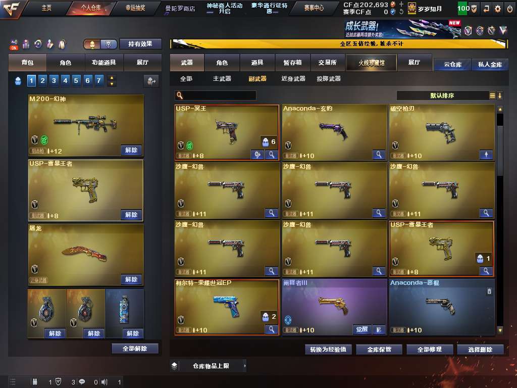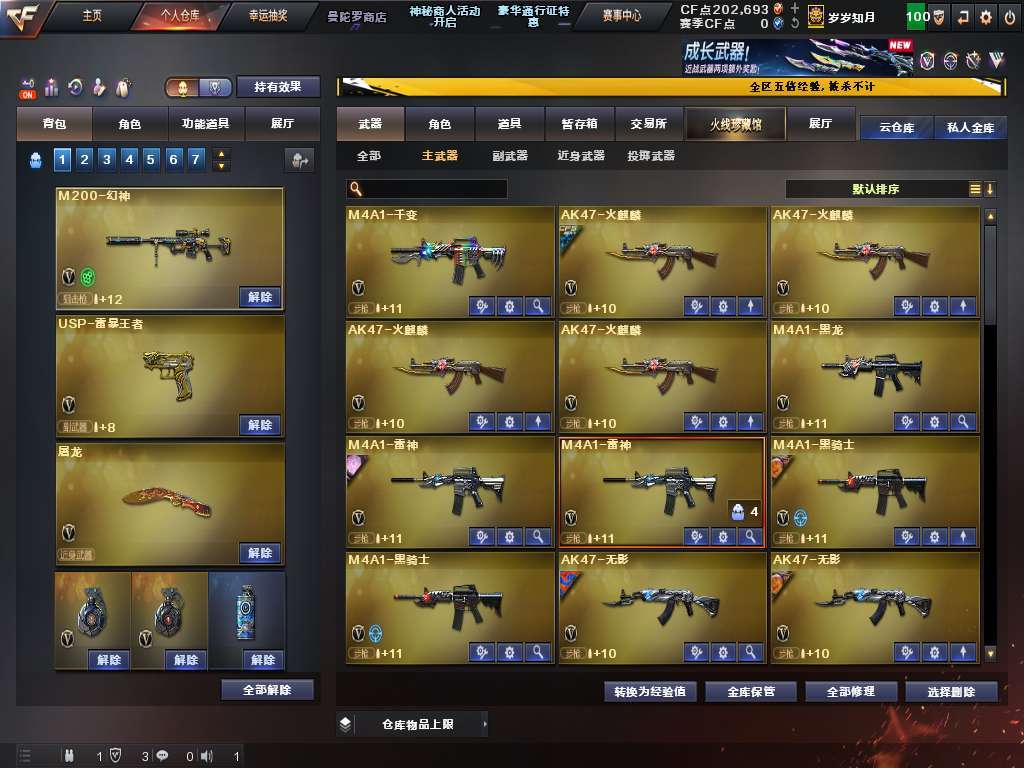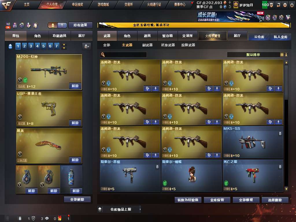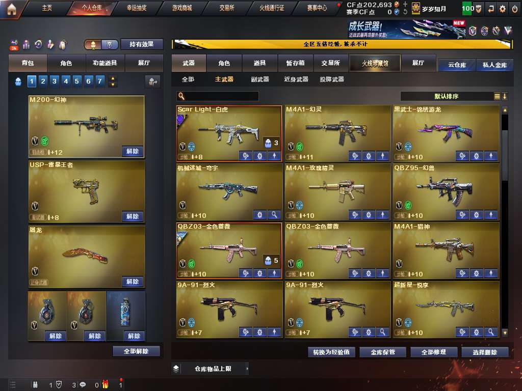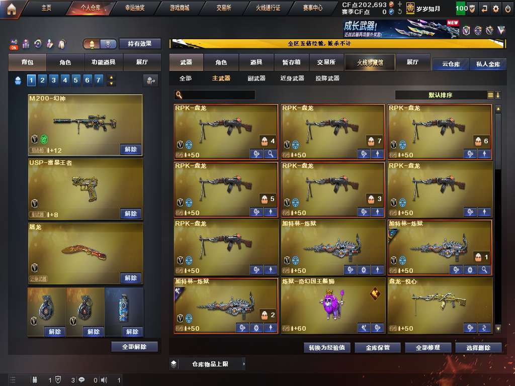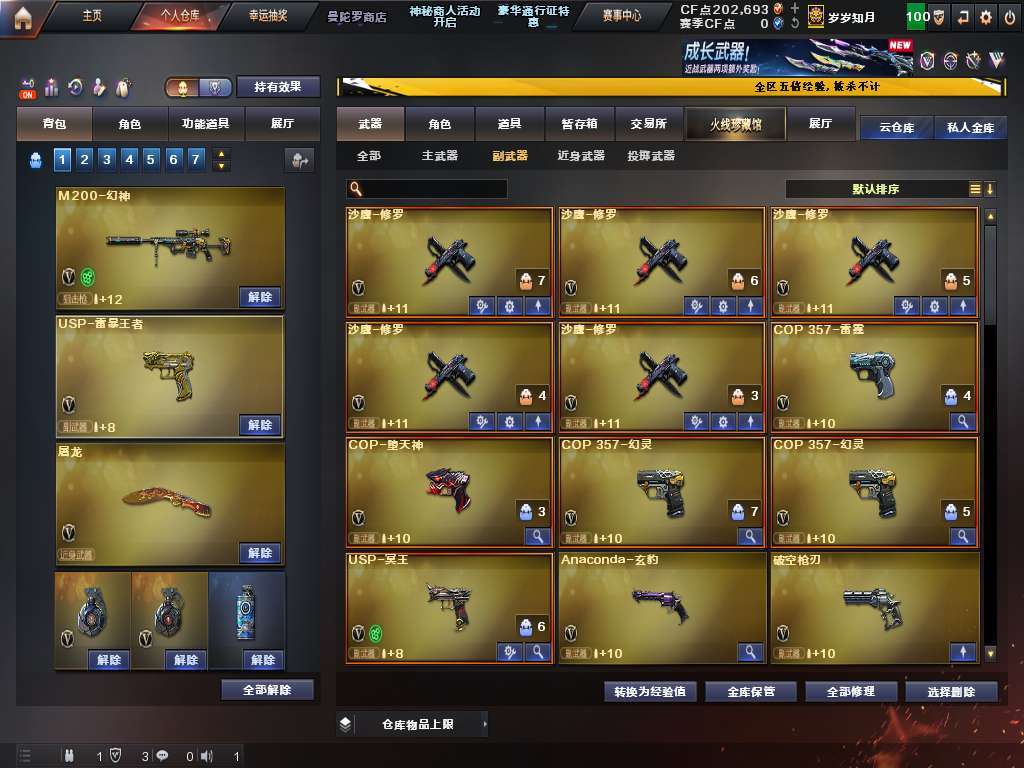 装备描述:100V6盘龙烈龙斯太尔蝴蝶奇幻狮子,幻神白虎qbz幻兽,7把质量手枪,有炼狱音效卡。