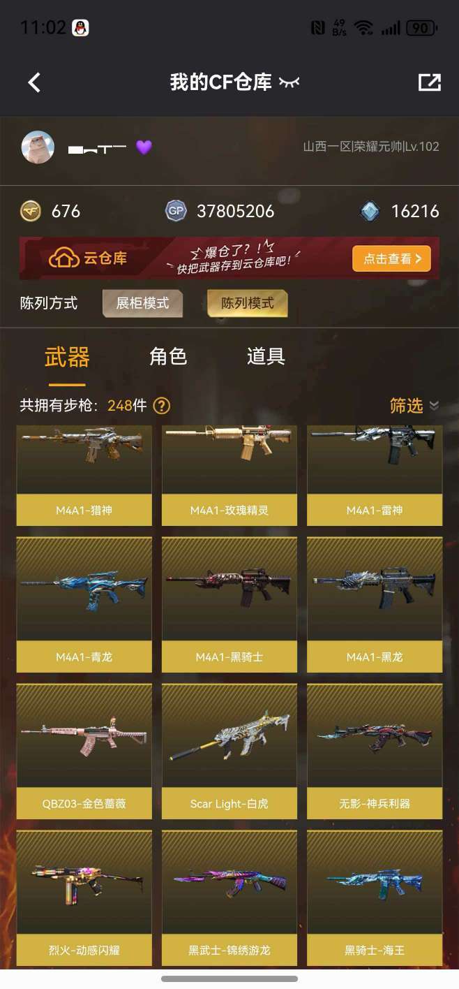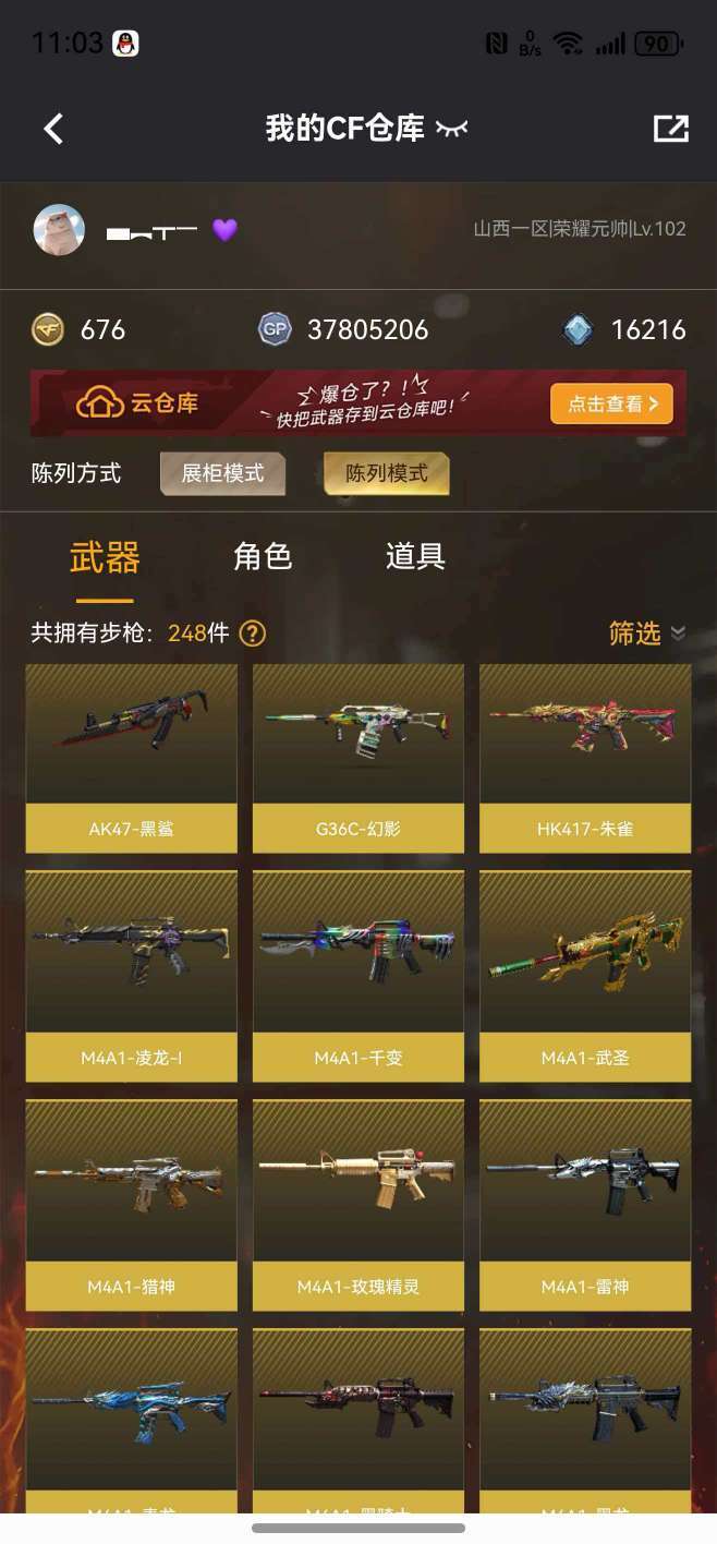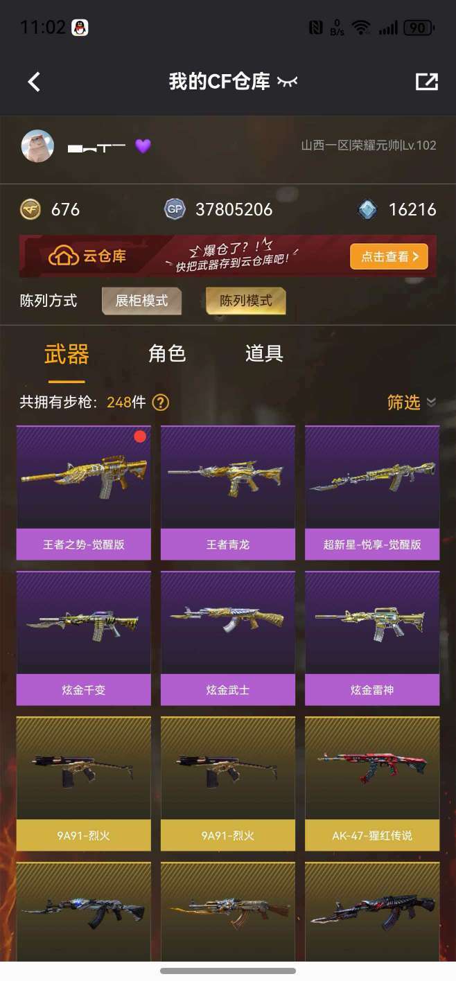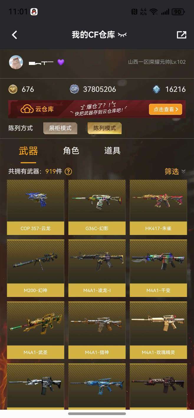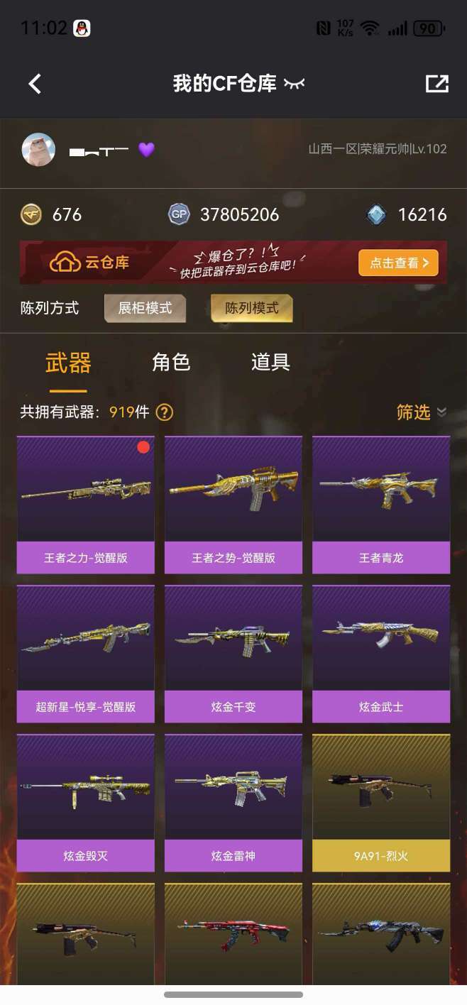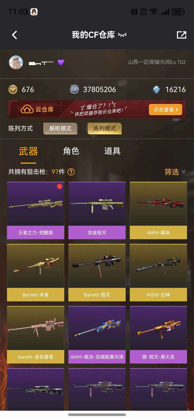 装备描述:枪王 62V传说艾丽莎⭐️幻神毁灭青龙白虎朱雀G36C幻影⭐️4炫金⭐️5王者⭐️挑战武器大多数⭐️爆破全能