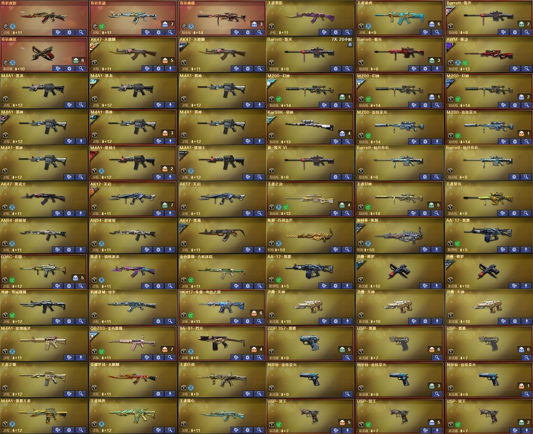 装备描述:传说:幽瞳+幽冥+夜影+圣域+星骇4防 主流武器:3幻神/13皮带卡+星神+裁决-各5皮带卡 主流武器:QBZ/6皮带卡+毁灭/12皮带卡 主流武器:1王者幻神+2竞技荣光套+EP全套 主流角色:4防云悠悠+4防晴雅+4防 隼+4防星骇+关小玉+荆棘+机械姬+星际战将+妮妮+王者雨墨+王者魅影+王者瞳+潘多拉X-N等 主流步枪:G36C幻影+王者白虎+王者凌虎+(5雷神/13皮带卡+2火麒麟/10皮带卡+2黑骑士/7皮带卡) 主流手枪:USP-雷暴2+USP-雷暴王者1+USP-瞑王6+白鲨柯尔特2+冠军柯尔特2+EP柯尔特1+竟技荣光柯尔特3+王者破空枪刃1+1COP雷霆+1COP雪域霜狐。 主流近战:1EP小刀+1蝴蝶刀2皮+7屠龙8皮+4龙啸7皮+4擎天+5麒麟刺+1玄豹匕首+1白鲨手套+2王者冰封+1冰龙 其它:毒蜂,宙斯,炼狱,清道夫、斯泰尔双面狐 等等(勉强打生化)