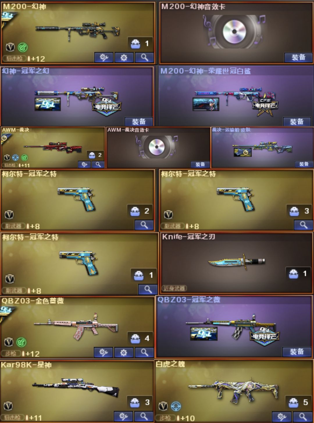 幻神冠军之幻白鲨四件套⭐裁决三件套⭐星神⭐三把冠军之特一把冠军之刃⭐qbz冠军之薇白虎之魄⭐四防人物