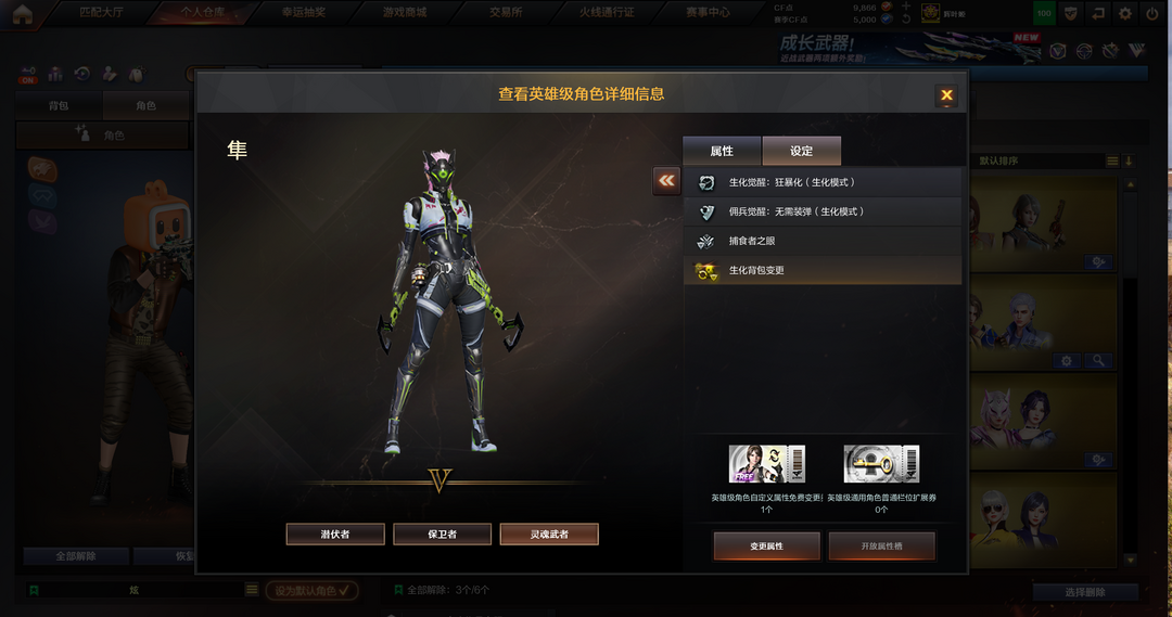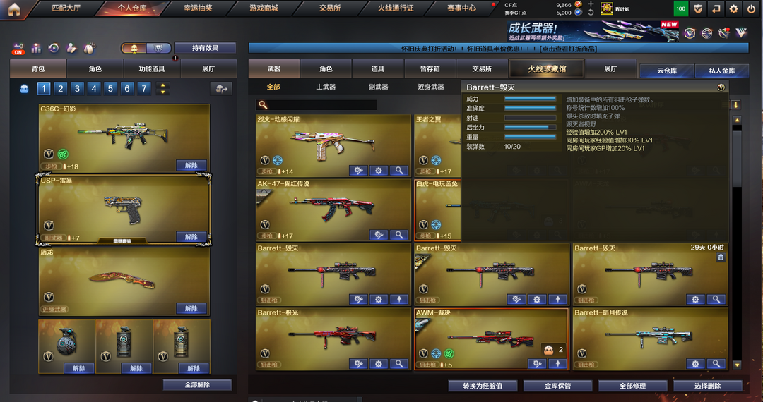 装备描述:六列蝴蝶炼狱隼白鲨手套,雷霆雷暴套,G36c白虎qbz裁决,可排位,爆破生化双全装