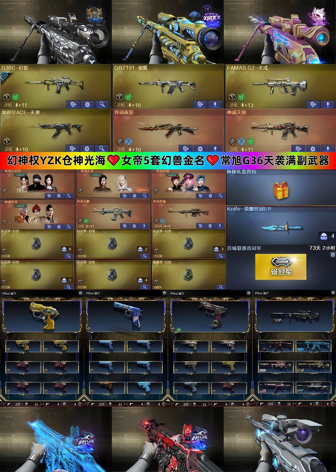 常旭YZK权幻神满皮❤五幻兽❤神威莲华天绫❤新活动全穿❤双光海夜岚❤加利尔法玛斯G36❤五花聚顶