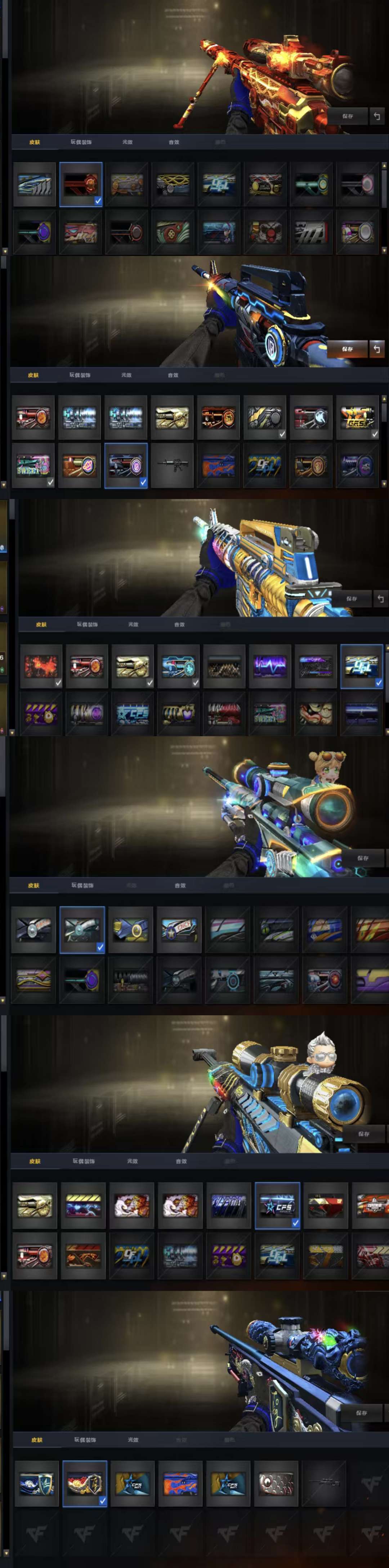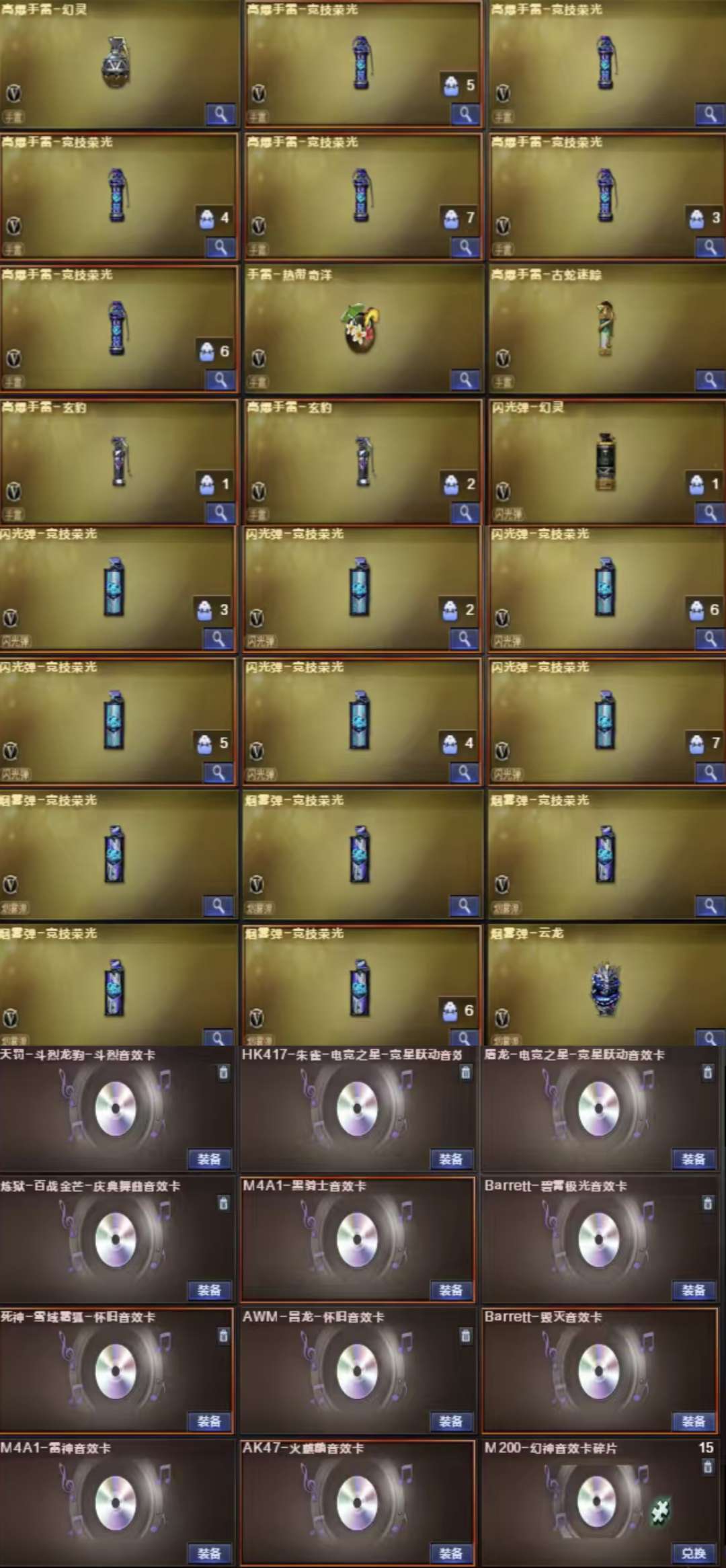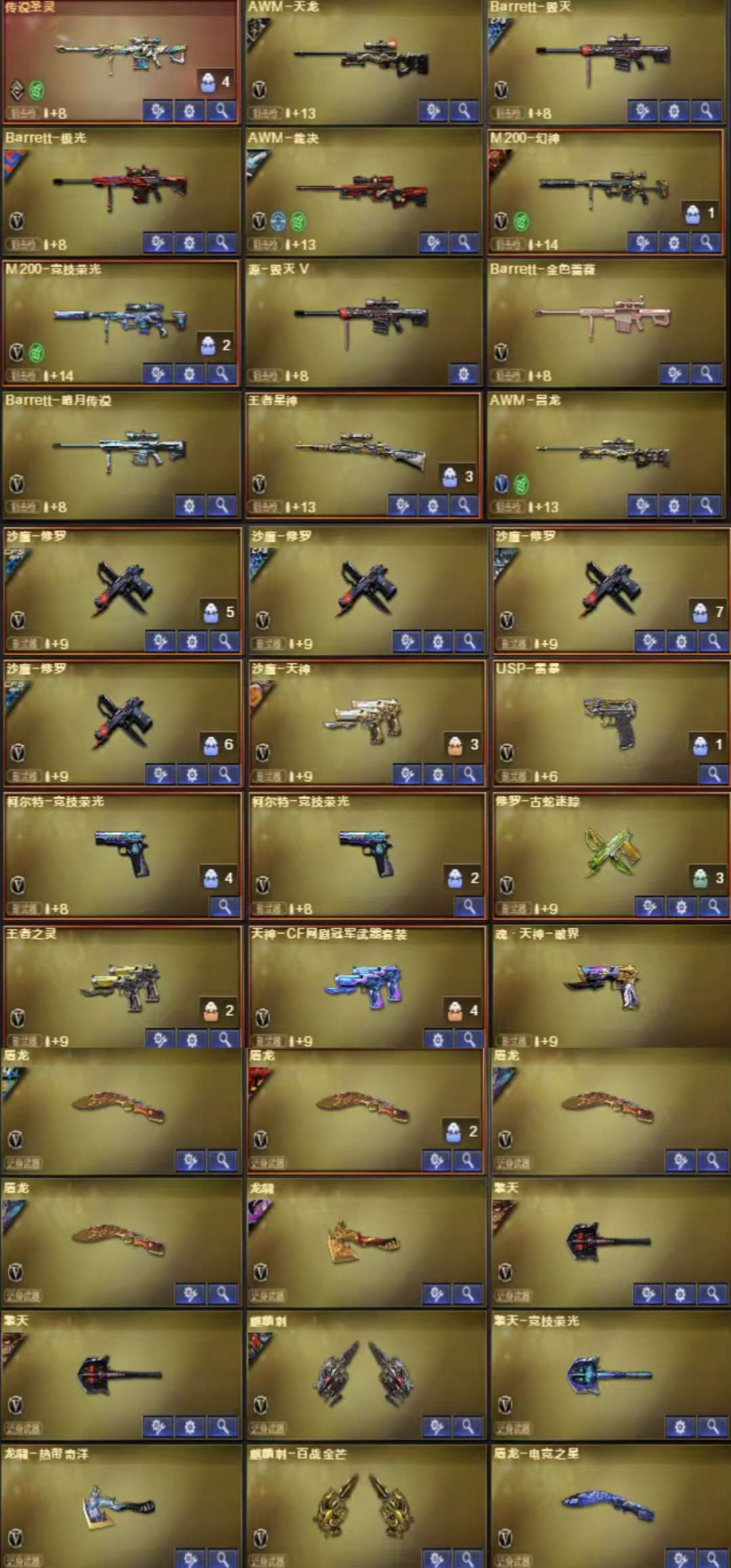 装备描述:传说武器:传说圣灵 王者武器10:王者星神、王者火魄、王者冰魄、王者之势、王者之武、王者之心、王者之锋、王者之城、王者之灵、王者之击 王者角色:王者春、王者魅影、王者凌霄 英雄级角色:云悠悠、炫、魅影以及各种三防蓝V和三防功能型角色 英雄级123:幻神(丹凤、电流骇客) QBZ03(破浪逐光) 柯尔特竞技荣光×2 USP雷暴 竞技荣光全套 网剧冠军套装 五盘二炼狱 四烈龙 六黑骑士 英雄级手七套 音效卡:雷神、黑骑士、火麒麟、毁灭 五修罗(CF STER、能量核心、2018、星空)一天神(暗月) 雷神(冠军LGD、CFS2019、耀金、虎将、再燃火线、宇航兔、星空) 黑骑士(冠军之势、地狱火、耀金、白马银枪、暗月) 火麒麟(传奇EVEN、华夏之心、雷神、CF STER、AG、百城、心动糖果、斗烈龙驹、再燃火线) 黑龙(361) 天龙(白鲨、70kg、秘银) 毁灭(AG、2018、耀金) 裁决(叶芒苍灵、羽掣、运输船、胜者为王) 无影(耀金、暗月) 屠龙×4(破浪逐光×2、荣耀、彼岸花、惊鸿)、屠龙斗烈龙驹、屠龙电竞之星、擎天、龙啸(青青莓果、蛇姬、再燃火线) 白虎电玩蓝兔AB背包