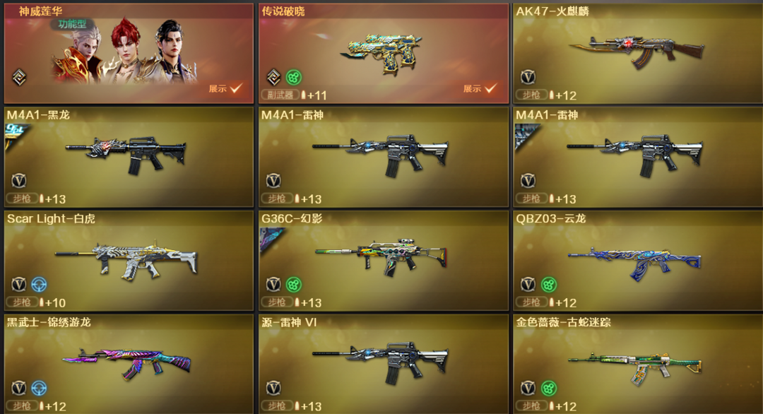 装备描述:【可排位】 神威莲华,传说破晓,幻神【音效卡星火小队皮】,裁决【音效卡】,星神【音效卡】,雷神【星空音效卡】,G36C【乘风逐浪皮】,白虎【音效卡】,6烈龙带死亡之眼,双蝴蝶刀带皮,冠军之刃等等