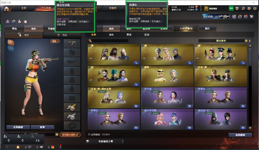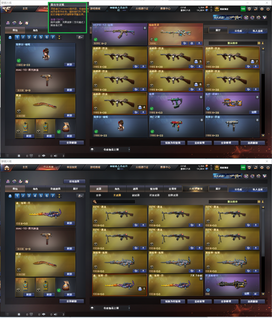 装备描述:排位:可以---------------生化全装(看僵尸血量):6烈、6盘、炼狱、斯太尔枪蝴蝶、毒蜂、VEPR-12-宙斯、传说圣灵、MAC-涂鸦、生化黄金钩、生化雷、超级对讲机、、、、、、爆破全装:幻神、COP雷霆、白虎、王者蔷薇、、、雷神音效、黑龙音效、、、7套雷霆、1套雷霆王者、、、生化人物(嘉年华灵狐、风暴女)