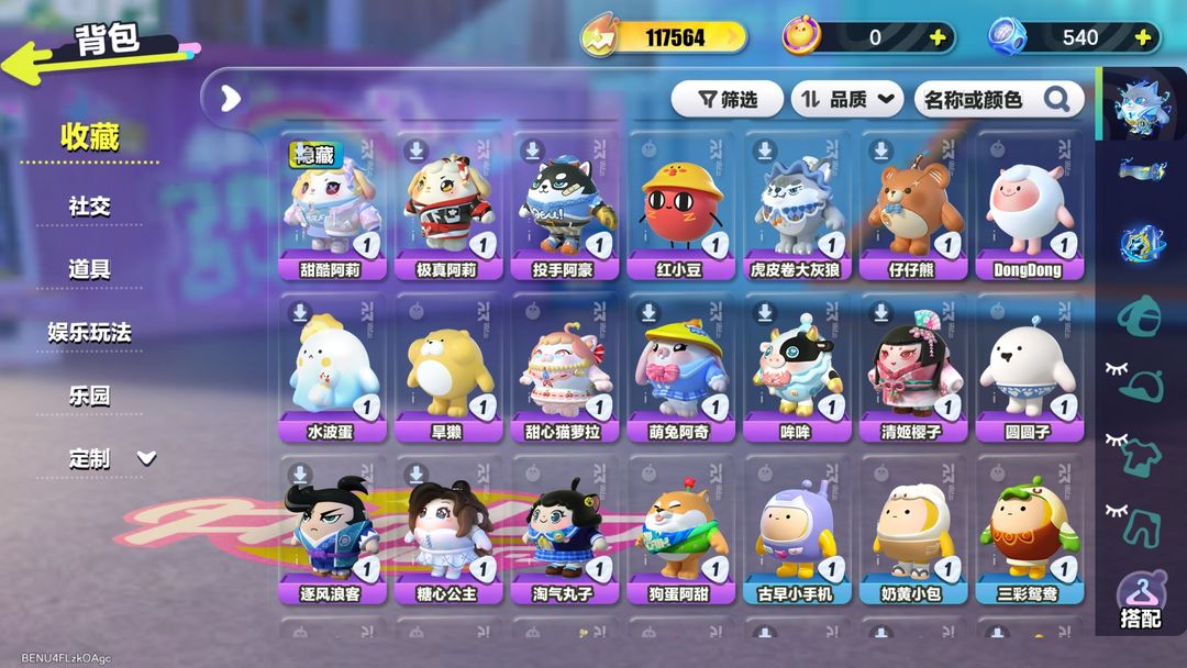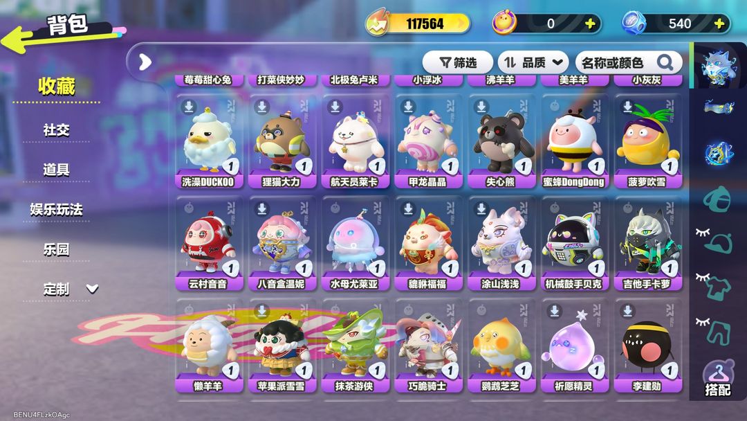 装备描述:闪电阿存,精灵莉斯尔,玉龙扶风,玉龙云岫,主唱曜星,蛋糕龙嗝嗝,元气丸子,仓鼠米仔,双面教师林野,超燃蛋小红,超燃蛋小蓝,劝学小子,大娃,执法官布谷,莓莓甜心兔,打菜侠妙妙,北极兔卢米,小浮冰,沸羊羊,美羊羊,小灰灰,洗澡 DUCKOO,狸猫大力,航天员莱卡,甲龙晶晶,失心熊,蜜蜂 DongDong,菠萝吹雪,云音音,八音盒温妮,水母尤莱亚,貔貅福福,涂山浅浅,机械鼓手贝克,吉他手卡萝,懒羊羊,苹果派雪雪,抹茶游侠,巧脆骑士,鹦鹉芝芝,祈愿精灵,李建勋,甜酷阿莉,极真阿莉,投手阿豪,红小豆,虎皮卷大灰狼,仔仔熊,DongDong,水波蛋,旱獭,甜心猫萝拉,萌兔阿奇,哞哞,清姬樱子,圆圆子,逐风浪客,糖心公主,淘气丸子,狗蛋阿甜,古早小手机,奶黄小包,三彩鸳鸯,瓢虫苗苗,月影摇摇兔,随行召唤器,鱼篓,星河弹弹车