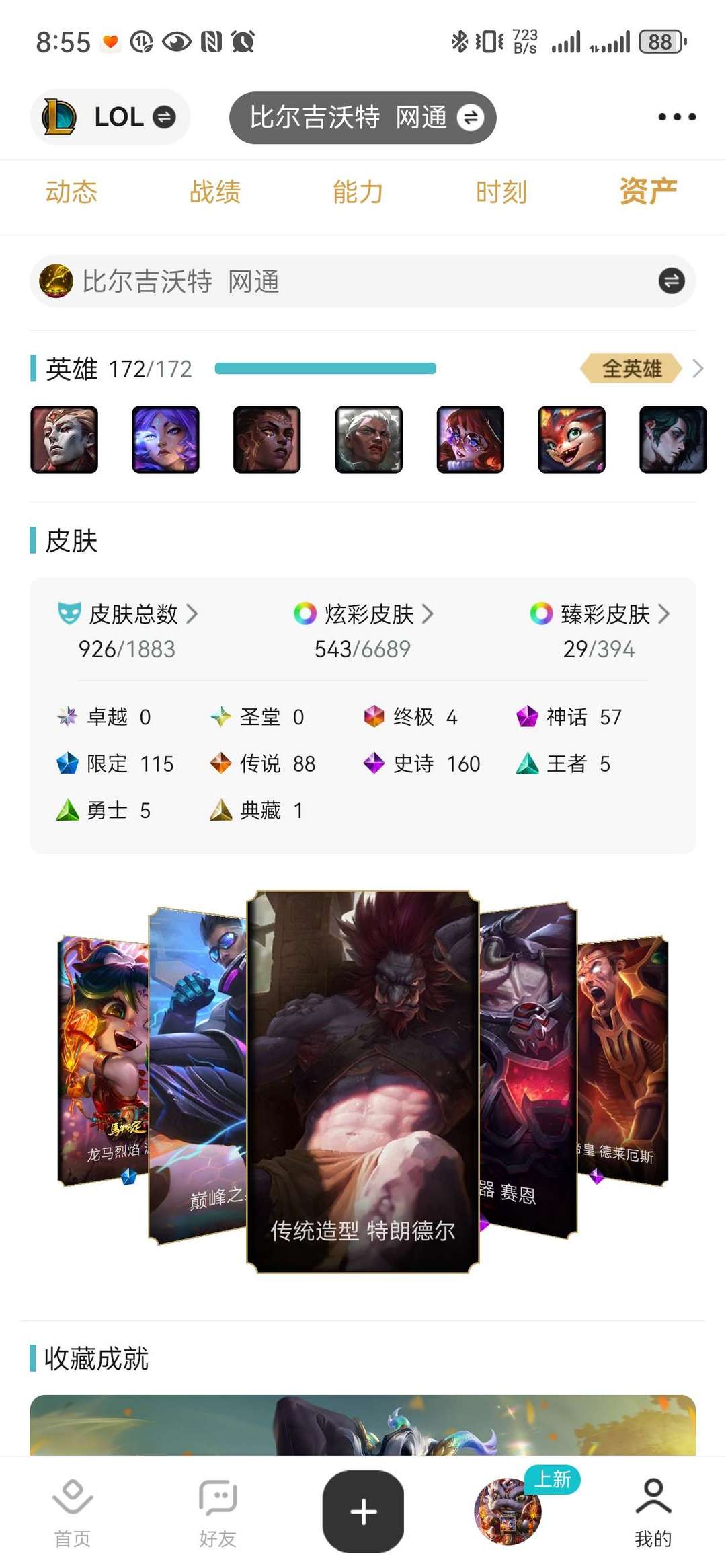 装备描述:(ノ^o^)ノ皮肤总量:整整926个!覆盖全英雄热门、冷门皮肤,几乎无遗漏,想开哪个玩哪个,告别皮肤荒,满足收集欲和展示欲,媲美典藏账号。 (〜^∇^)〜珍稀皮肤:164个神话+限定皮肤!包含海克斯、至臻、年限、赛事限定等稀缺款,高价值珍稀皮质感拉满,对局回头率100%。 └|゜ε゜|┐ 最新皮肤:同步更新2026年所有新皮肤,含新春限定及刚上线系列皮肤,租号直接解锁最新皮特效,无需等待。 ┗(^0^)┓排位权限:无任何限制,可正常打单双排、灵活排位,冲分、补分、练英雄刷胜率均可,账号状态稳定。