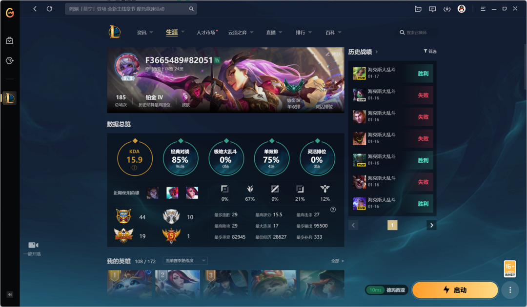 联盟五区·德玛西亚·单双铂金2·灵活白银1·匹配-乱斗-斗魂低隐藏分(陪玩娱乐精品号)