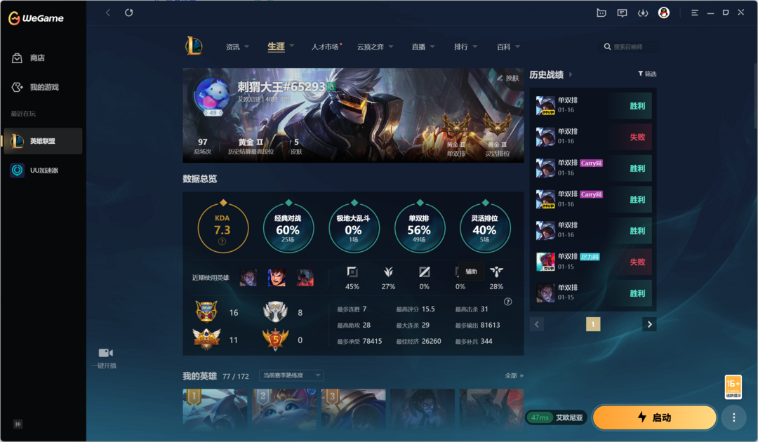 段位:49级 荣耀黄金II