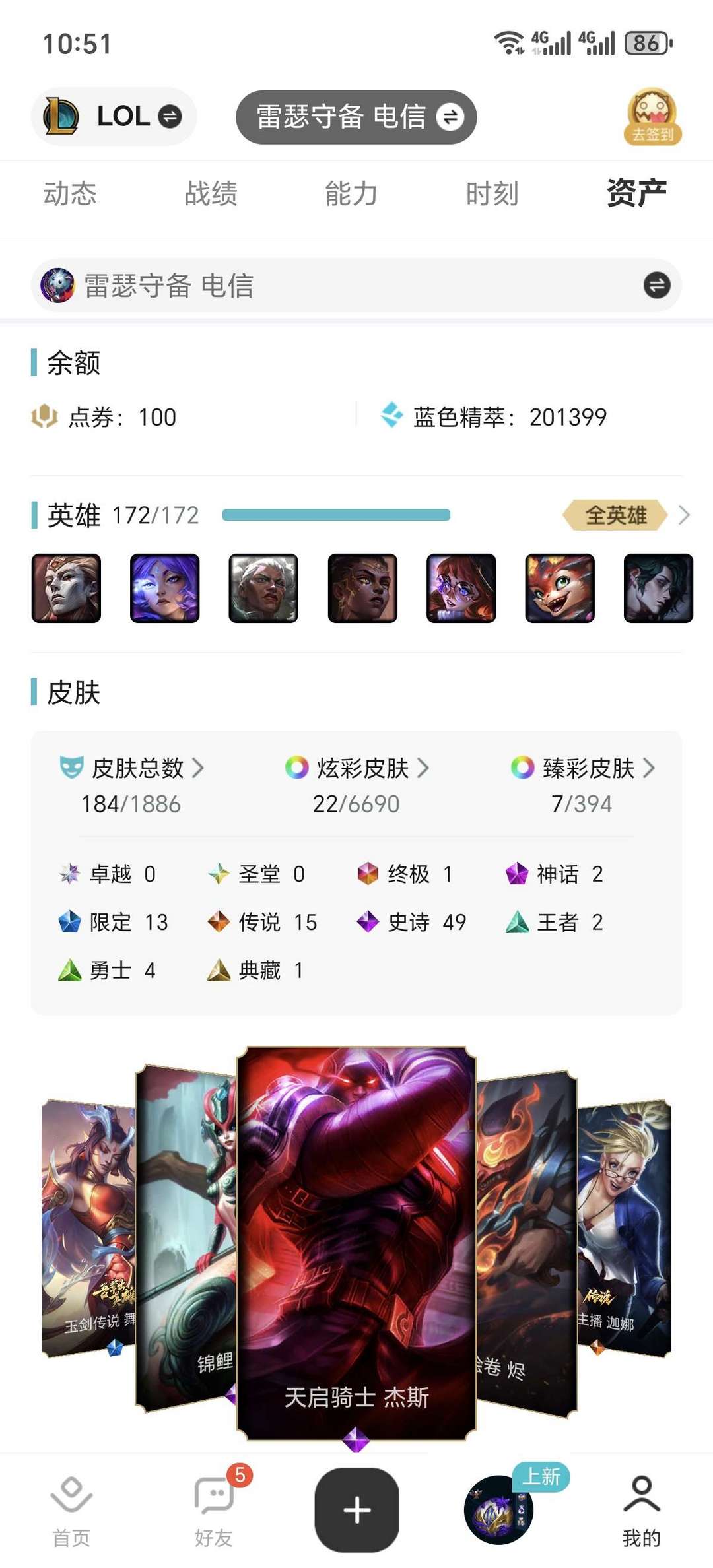188个英雄皮肤+全英雄+终极琴女皮肤+雷瑟守备+可排位