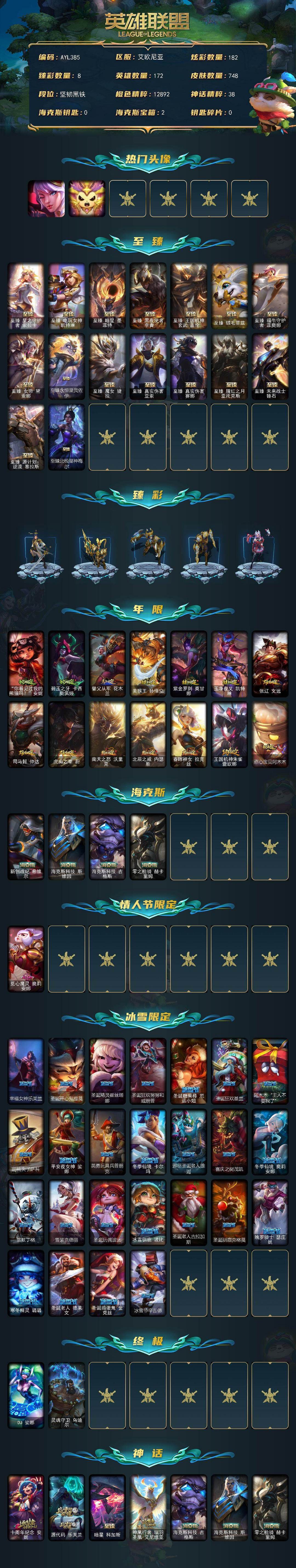 装备描述:172英雄-748皮肤-182炫彩-2终极-24神话-97限定-65传说-185史诗 【热门头像】:觅心之翼奎因头像,星守索拉卡头像 【至臻皮肤】:至臻星之守护者索拉卡,至臻电玩女神凯特琳,至臻暗星墨菲特,至臻黑夜使者李青,至臻王国机神玄武盖伦,至臻绒毛菲兹,至臻福牛守护者菲奥娜,至臻女帝黛安娜,至臻永恒星灵佐伊,至臻魔女婕拉,至臻真实伤害亚索,至臻真实伤害赛娜,至臻腥红之月亚托克斯,至臻未来战士锤石,至臻源计划逆流塞拉斯,至臻北极星神梅尔 【臻彩皮肤】:玉剑传说无极白虎,吕布奉先炫金战神,冠军之血希瓦娜凯旋圣装,冠军之隐劫凯旋圣装,魅惑女巫迦娜炫金,星之守护者卡莎热情之光,红莲之刃锐雯 【年限皮肤】:你看见过我的熊猫吗安妮,碧玉之牙卡西奥佩娅,替父从军花木兰,美猴王孙悟空,紫金罗刹莫甘娜,玉净夜叉凯特琳,张辽文远,司马懿仲达,虎痴之拳蔚,南天之怒沃里克,北辰之威内瑟斯,春晖神女拉克丝,王国机神朱雀蕾欧娜,点心宝贝阿木木 【海克斯皮肤】:新创战纪希维尔,海克斯科技斯维因,海克斯科技吉格斯,零之枪骑赫卡里姆 【情人节限定】:觅心魔灵奥莉安娜 【冰雪限定】:幸福女神乐芙兰,圣诞开心鬼提莫,