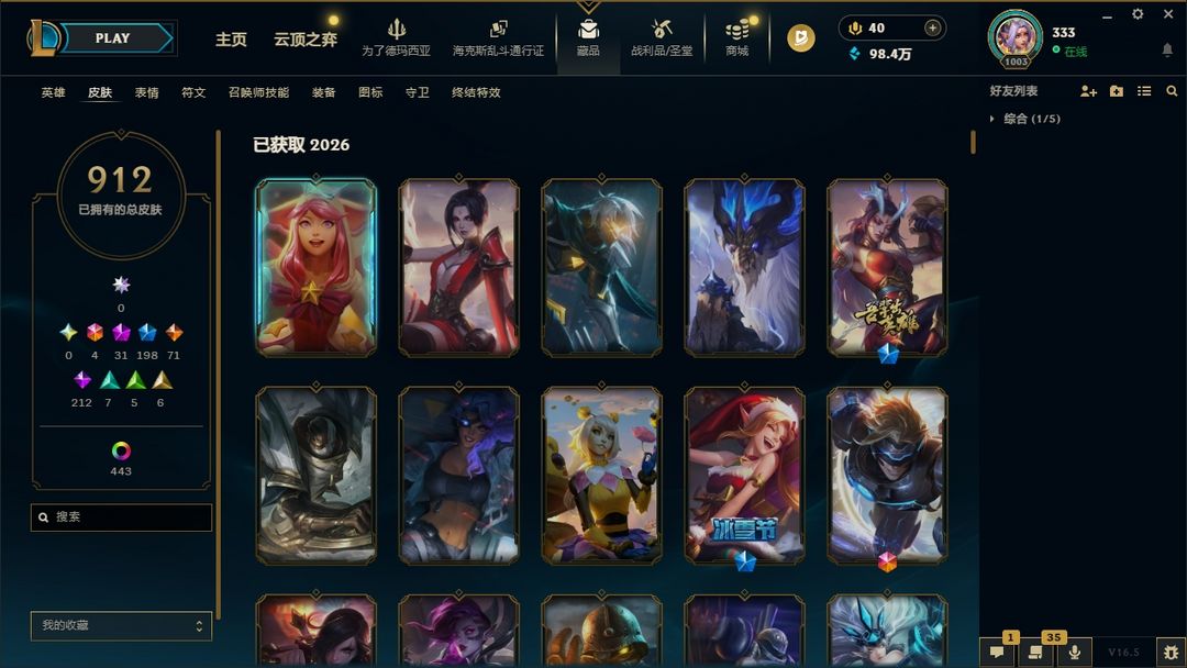 艾欧尼亚❤912原皮❤443炫彩❤段位实时❤大元素❤未来战士