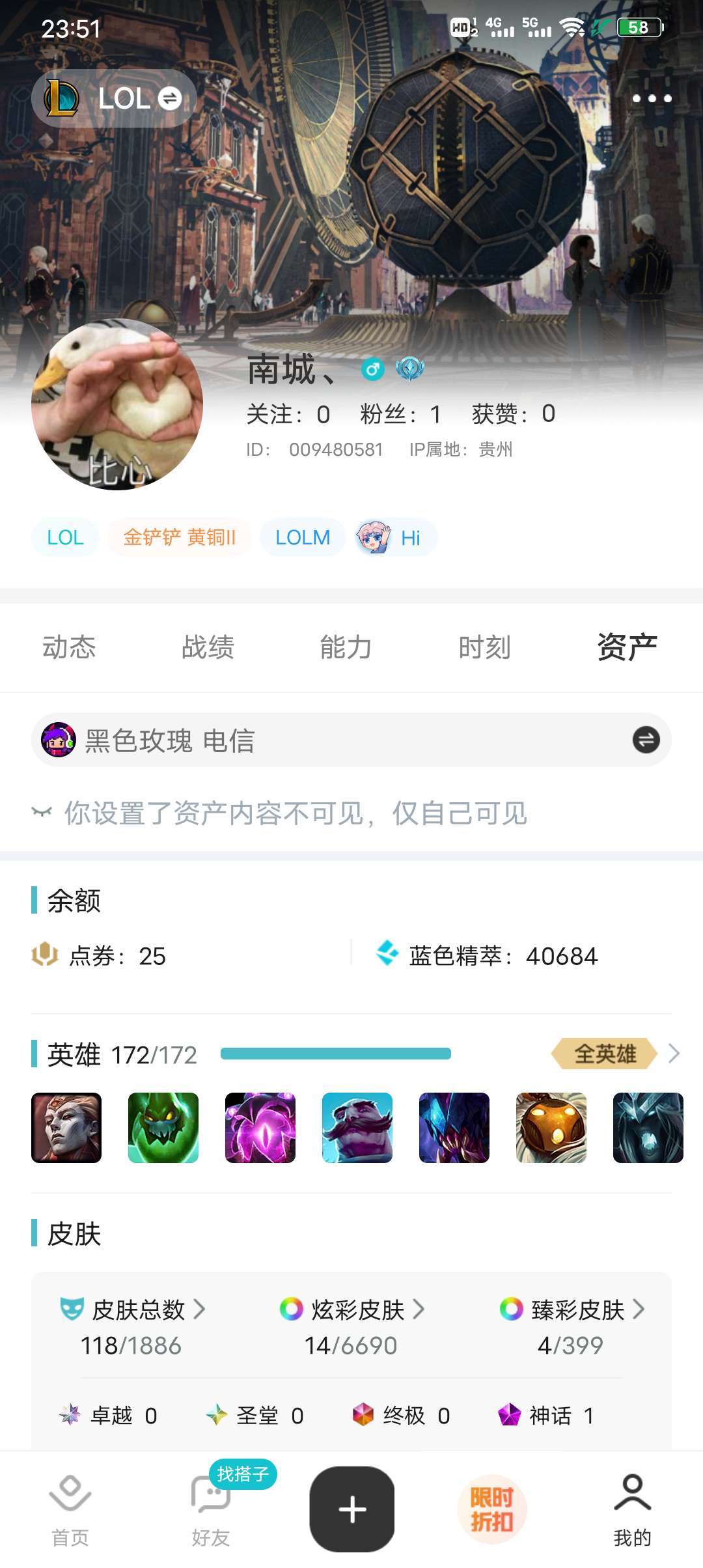 装备描述:全英雄,,适合与朋友开黑,皮肤多多可排位
