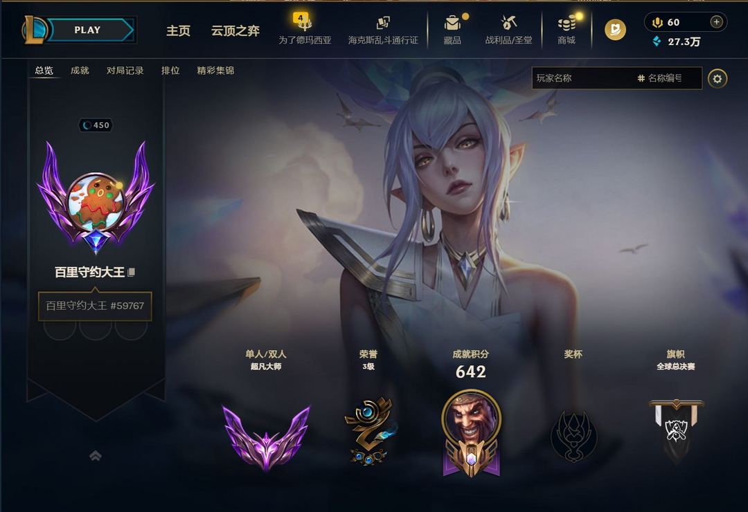 [艾欧尼亚超凡大师可排位]300点高分段狙击主播陪玩必备丨全英雄基本都有皮肤丨高胜率高隐藏丨