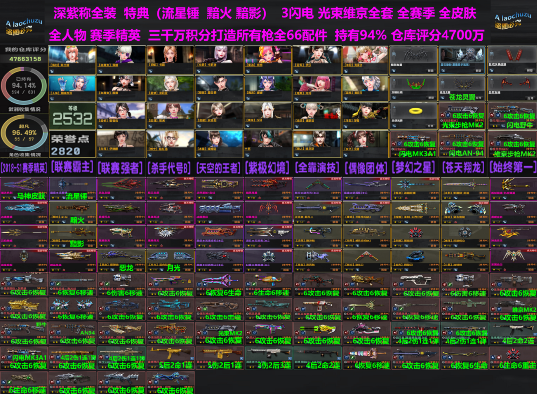 限制: 撤单率<30%才可租用此帐号装备描述:电二深紫称号,2600级。2850点荣誉。紫钻特权全武器。绝版荣誉,绝版皮肤,战旗、2018赛季精英。光束步枪123,维京步枪全套。闪电MK3A1、闪电野牛、闪电AN94、雷索-流星锤、黯火、黯影、恶龙、特典狙-黯影、月光、弧光回旋刃、日冕加特林。全24个赛季、全部超凡人物。全部皮肤枪。持有94%,仓库评分4700万,绝版武器,极品强化。三千万积分打造顶级配件。 【已去黑雾,画面优化,画质清晰。【欢迎收藏】