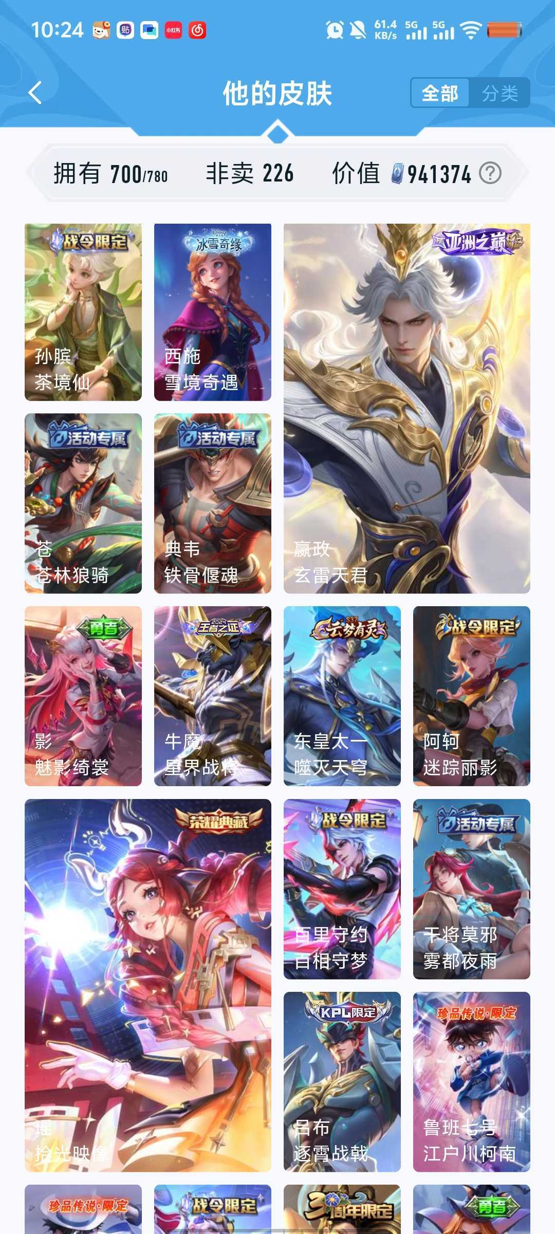 限制: 租号3次及以上 | 撤单率<40%才可租用此帐号装备描述:典藏粉猫小兵、灵宝! 满典藏,满至尊兔年天幕和击败 700皮18典藏9星百+传说等你来战! 提示把游戏的定位权限关了 最新李信问心剑曹操诡秘之主元歌等联动全套,相柳三丽鸥瑶安,闪光云缨,神器赵怀真,嬴政玄雷天君、柯南基德、昭君山客、瑶典藏、李白谪仙、庄周牧神、星界特工马可、涂山红红、阿离无双、霜北刀冥王铠、火舞无双、皮影芈月、海诺朵朵韩信、婉儿墨子海月亚连,魔女龙年琥珀,商城全清空,至美双,时之奇旅乔鲁,影龙兰陵吕布宫本,真我瑶,海月婉儿马可妄想,东皇韩信典藏诸葛电玩澜,亚瑟安吉拉至尊九尾武则天明辉,刘关张阿离玉环浮生妄,镜木兰燃星,虞姬项羽倾心,伽罗炽翼,貂蝉典藏,猴子盘古兔年全,凯银白,吕布怒海,dc上官狄仁阿骨朵火舞,弈星王昭君,关羽赤影,碎云守约,天狼星狩猎,枫霜尽橘子,圣诞蔡文姬,前尘镜,热情桑巴,音你,苏烈木兰百里玄武志,电玩狂铁,唐玄奘,马可深海,后羿无尽星芒!花木兰九霄神辉!星传说刘备猴子小狄,金仲夏夜,武幻海之心,粉机甲大小姐,宫魔神之眼,诸葛星域,铠青龙,李逍遥,马超无双,露娜启示,瑶瑶云中情人,鲁班虎年,关羽武圣,韩信傲雪,一念神魔,赵云世冠,西施游龙,遇见胡璇。
