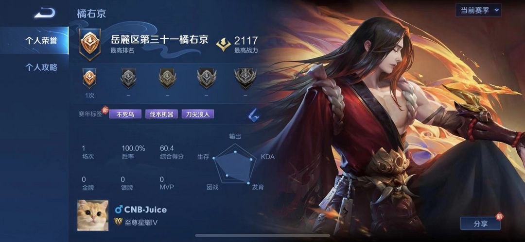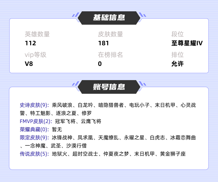 装备描述:【毁号,涉及毁坏虚拟财产罪及计算机安全罪,请文明游戏素质游戏,让我们共建美好租号平台】本游戏账号V8用户,基础段位:至尊星耀IV全英雄 超多限定皮 橘右京以及多个英雄区级标 可排位 希望体验皮肤或者带朋友排位的不二之选哦