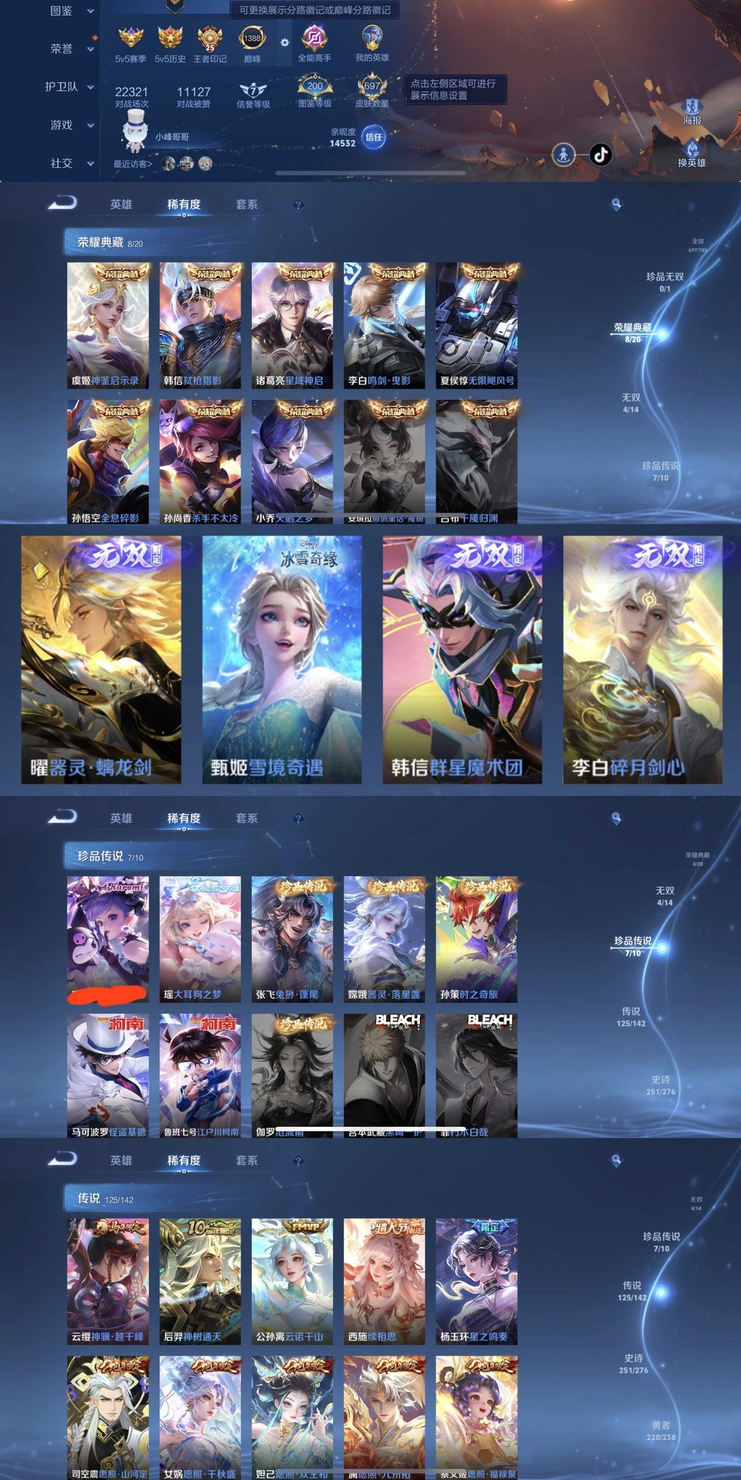 限制: 租号2次及以上 | 撤单率<49%才可租用此帐号装备描述:时间到了还登录白玩或者顶号全部改密拉黑处理永不解除,顶号机器会秒禁玩改密,顶号不仅拉黑还没得玩,赚三两块不容易,请理解谢谢。 ❤❤❤❤❤❤❤❤❤❤❤❤❤❤❤❤❤❤ 请勿开挂,挂机,送头,骂人,撤单后游戏等如有违规永久拉黑永不解除。 重置二级密码不要费劲了,号主每天都会上号查看,多行不义必自毙,人在做天在看,多做好事多自律,少做缺德事。 该号英雄128个皮肤697个,典藏8个,无双4个,珍品传说7个,星传说6个,传说125个,史诗251个,祝您游戏愉快~