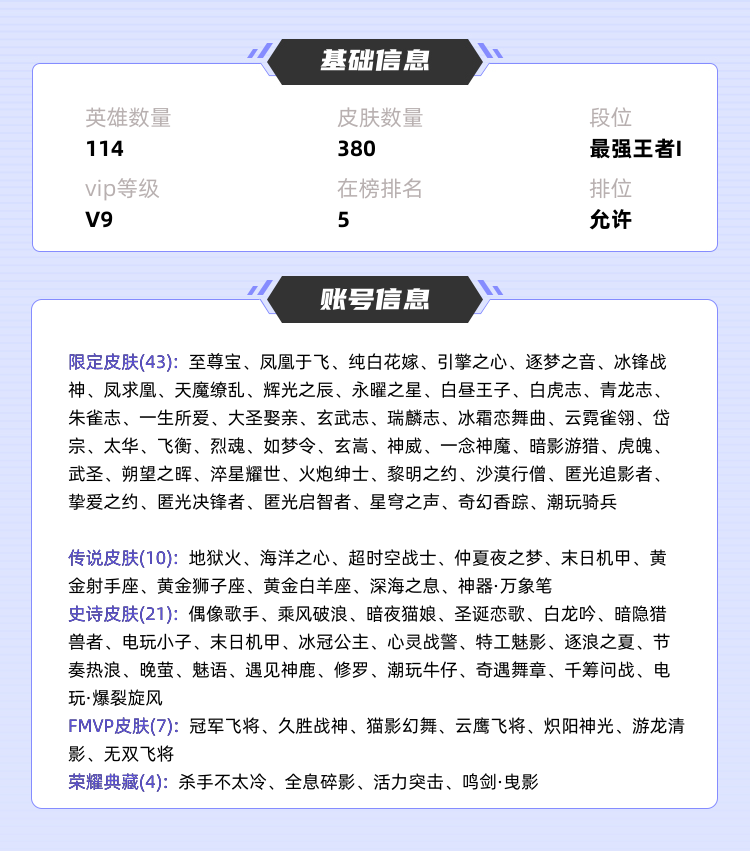 装备描述:384皮v9马上v10带29传说35按键,荣耀水晶: 九霄神辉 传说皮: 黄金狮子座,黄金射手座,冠军飞将,云鹰飞将,猫影幻舞,炽阳神光,一念神魔,末日机甲-孙尚香,地狱火,仲夏夜之梦,地狱之眼,飞鸢探春,胖达荣荣,超时空战士-狄仁杰,音你闪耀,山海·炽霜斩,山海·苍雷引,浮生妄,灼幽烈阳,惊梅引,遇见神鼓,神树通天 限定皮: 遇见飞天,梁祝,蜜橘之夏,逐梦之音,青春决赛季,天狼狩猎者,冰霜恋舞曲,热情桑巴,逐梦之光,神奇女侠,凤求凰,美猴王,白虎志,青龙志,瑞麟志,玄武志,朱雀志,梅西,一生所爱,大圣娶亲,高山流水,孙行者,猪悟能,时之祈愿-云中君,深海之息,前尘镜,五谷丰年,山海·玄木吟,无限倾心-虞姬,鸣野蒿
