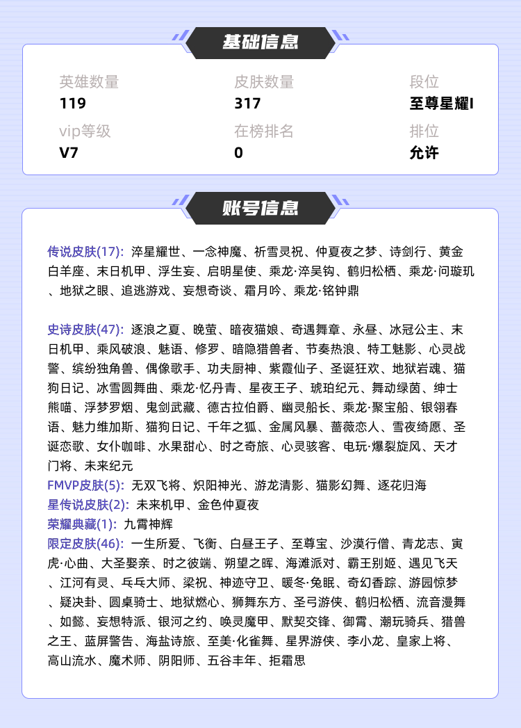 装备描述:>>>>>>毁号,涉及毁坏虚拟财产罪及计算机安全罪,请文明游戏素质游戏,让我们共建美好租号平台>>>>>> 本游戏账号: ,英雄多,皮肤多。典藏皮肤1个,感受典藏皮肤带来的优质体验快感,FMVP皮肤5个,尽情享受FMVP皮肤带来的主角光环, 私人所属英雄皮肤有:花木兰 九霄神辉李信 一念神魔||孙尚香 末日机甲||孙尚香 乘龙·问璇玑||李白 诗剑行||上官婉儿 妄想奇谈||安琪拉 追逃游戏||夏洛特 浮生妄||虞姬 启明星使||貂蝉 仲夏夜之梦||张良 黄金白羊座||孙策 乘龙·淬吴钩||赵云 淬星耀世||赵云 乘龙·铭钟鼎||露娜 霜月吟||云缨 鹤归松栖||公孙离 祈雪灵祝||宫本武藏 地狱之眼,等等 注意事项: A.游戏过程中请不要恶意挂机或者不文明发言;B.恶意挂机、顶号等行为将被拉黑无法再次下单;C.进入游戏后中途请勿退出登陆,否则无法再次上号;D.部分账号由于异地登录可能会出现密码错误提示,通常再尝试5-6次后可上号。 |||||||||>喜欢本账号请点 ☆收藏☆ 方便下次租用,谢谢光临惠顾|||||||||