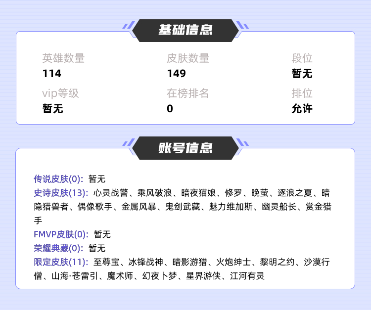 装备描述:>>>>>>毁号,涉及毁坏虚拟财产罪及计算机安全罪,请文明游戏素质游戏,让我们共建美好租号平台>>>>>> 本游戏账号: ,英雄多,皮肤多。 私人所属英雄皮肤有:关羽 冰锋战神||孙悟空 至尊宝||暃 星界游侠||曜 山海·苍雷引||狄仁杰 魔术师||芈月 幻夜卜梦||达摩 沙漠行僧||阿古朵 江河有灵||雅典娜 黎明之约||马可波罗 暗影游猎||黄忠 火炮绅士,等等 注意事项: A.游戏过程中请不要恶意挂机或者不文明发言;B.恶意挂机、顶号等行为将被拉黑无法再次下单;C.进入游戏后中途请勿退出登陆,否则无法再次上号;D.部分账号由于异地登录可能会出现密码错误提示,通常再尝试5-6次后可上号。 |||||||||>喜欢本账号请点 ☆收藏☆ 方便下次租用,谢谢光临惠顾|||||||||