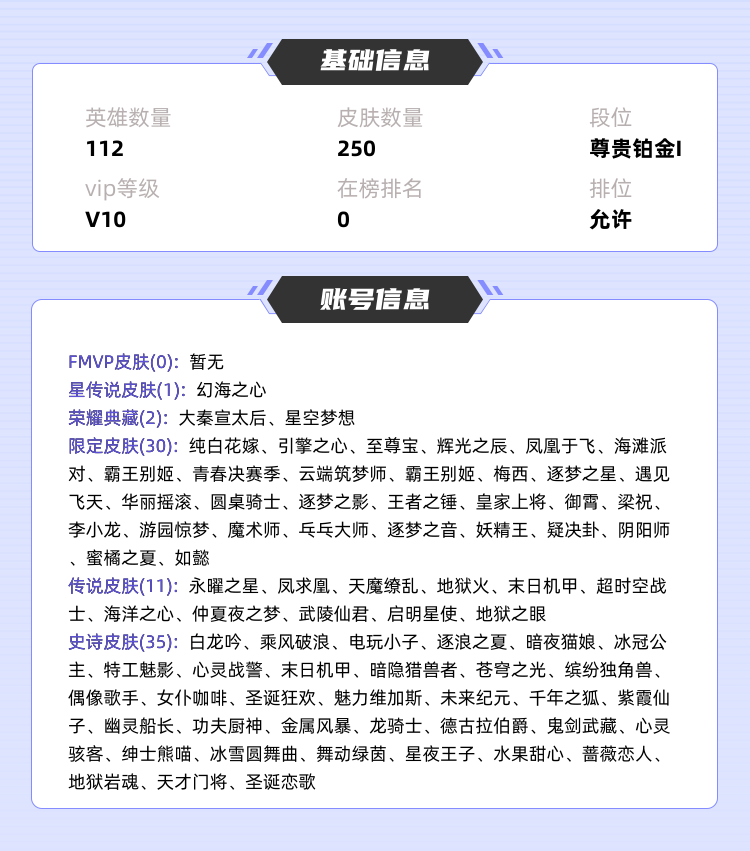 装备描述:>>>>>>毁号,涉及毁坏虚拟财产罪及计算机安全罪,请文明游戏素质游戏,让我们共建美好租号平台>>>>>> 本游戏账号: V10用户,基础段位:永恒钻石I,英雄多,皮肤多。典藏皮肤2个,感受典藏皮肤带来的优质体验快感, 私人所属英雄皮肤有:鲁班七号 星空梦想||芈月 大秦宣太后虞姬 启明星使||吕布 天魔缭乱||杨戬 永曜之星||诸葛亮 武陵仙君||李白 凤求凰||貂蝉 仲夏夜之梦||武则天 海洋之心||孙悟空 地狱火||狄仁杰 超时空战士||宫本武藏 地狱之眼||孙尚香 末日机甲,等等 注意事项: A.游戏过程中请不要恶意挂机或者不文明发言;B.恶意挂机、顶号等行为将被拉黑无法再次下单;C.进入游戏后中途请勿退出登陆,否则无法再次上号;D.部分账号由于异地登录可能会出现密码错误提示,通常再尝试5-6次后可上号。 |||||||||>喜欢本账号请点 ☆收藏☆ 方便下次租用,谢谢光临惠顾|||||||||