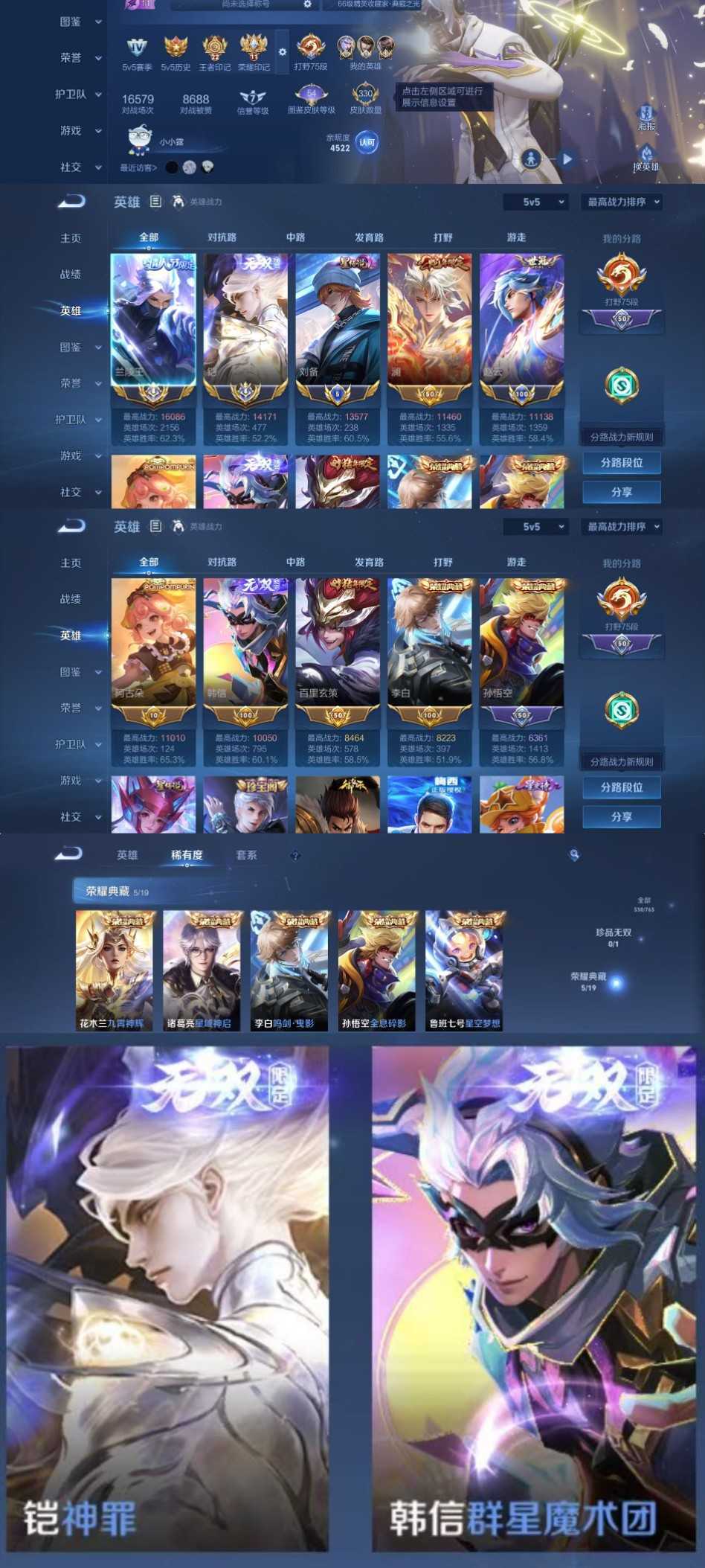 75段打野✨历史大国服兰陵王大国服凯✨国五刘备国服赵云✨万战澜万战韩信万战阿古朵✨神罪荆棘舞步九州拓