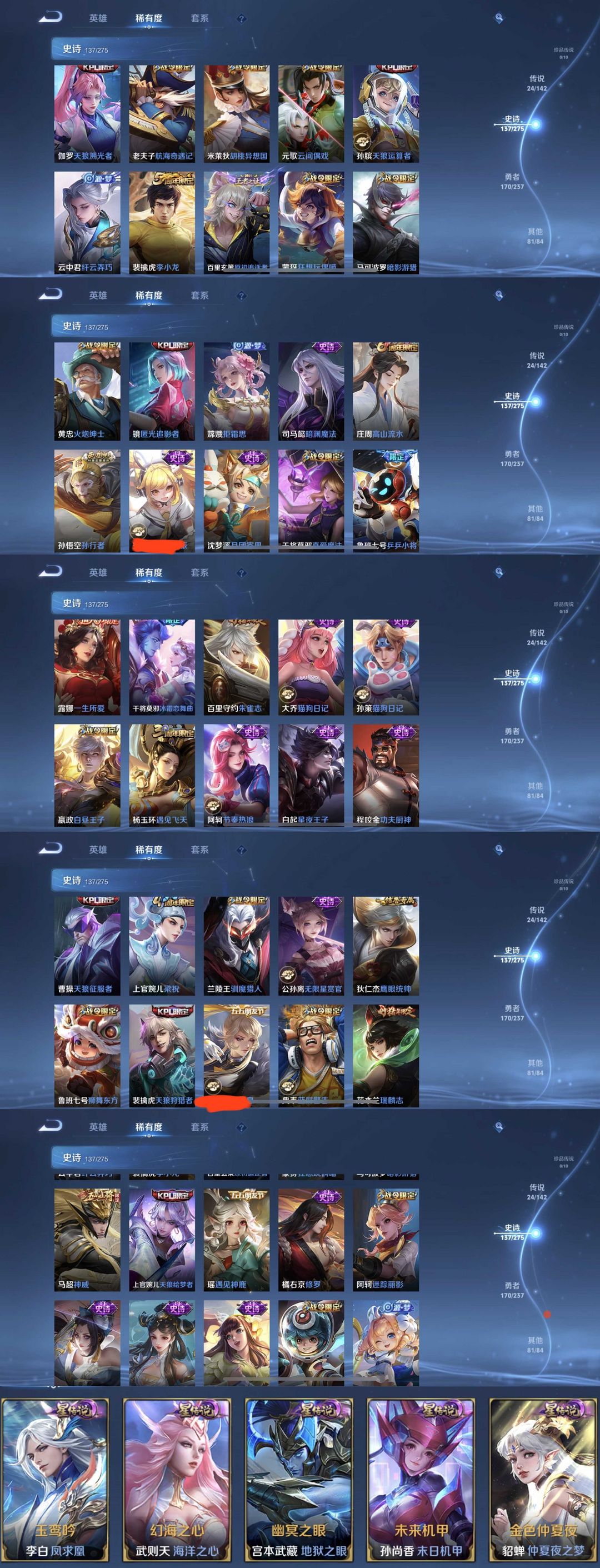 限制: 撤单率<49%才可租用此帐号装备描述:时间到了还登录白玩或者顶号全部改密拉黑处理永不解除,顶号机器会秒禁玩改密,顶号不仅拉黑还没得玩,赚三两块不容易,请理解谢谢。 ❤❤❤❤❤❤❤❤❤❤❤❤❤❤❤ 请勿开挂,挂机,送头,骂人,撤单后游戏等如有违规永久拉黑永不解除。 重置二级密码不要费劲了,号主每天都会上号查看,多行不义必自毙,人在做天在看,多做好事多自律,少做缺德事。 该号英雄129个皮肤415个,典藏4个,星传说5个,传说24个,史诗137个,祝你游戏愉快~
