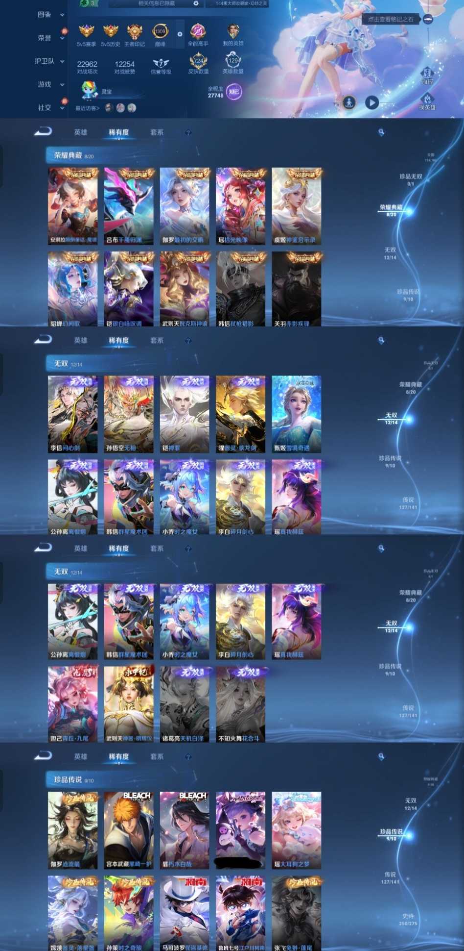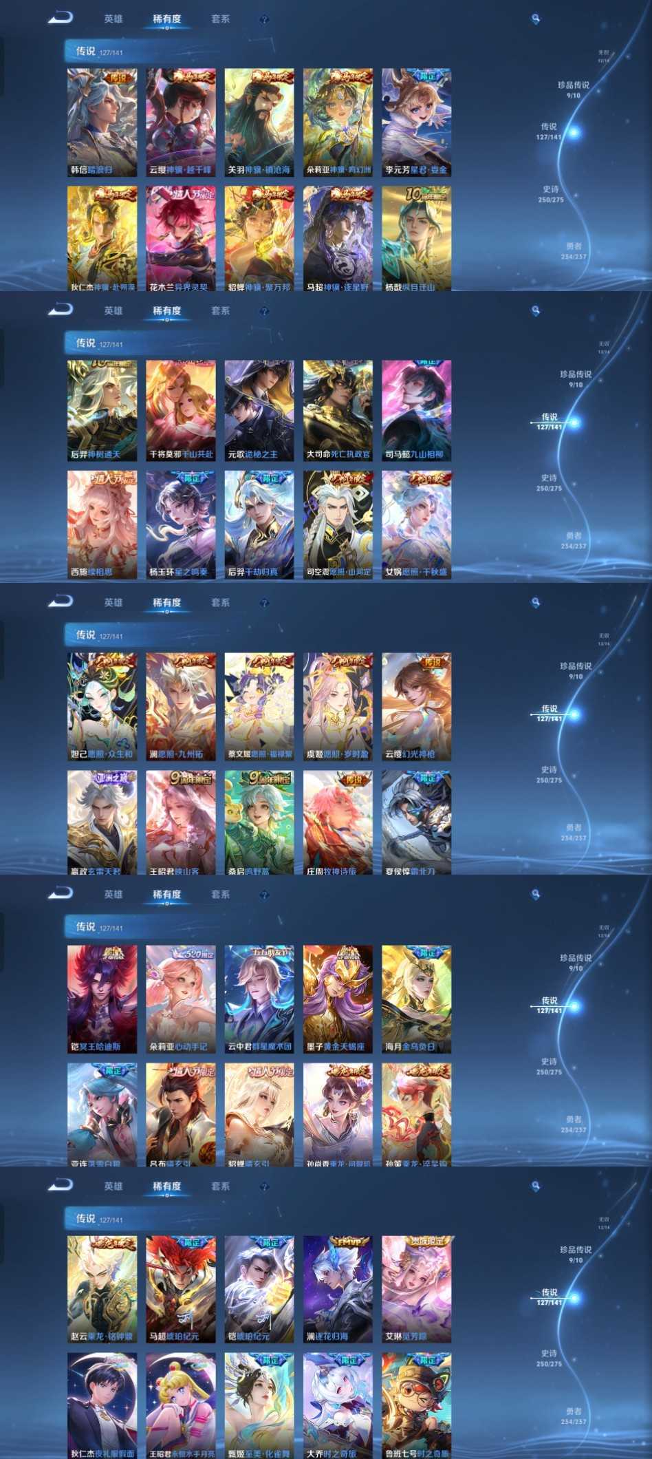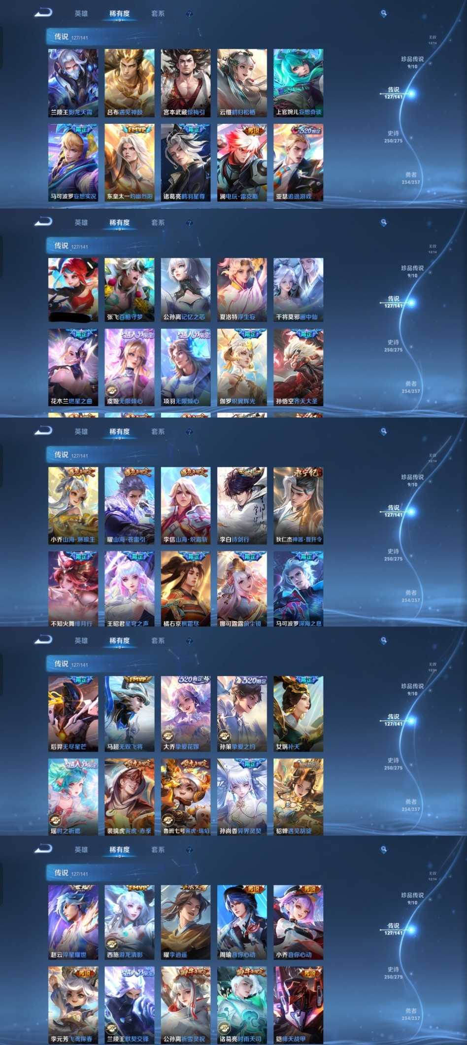 限制: 撤单率<49%才可租用此帐号装备描述:时间到了还登录白玩或者顶号全部改密拉黑处理永不解除,顶号机器会秒禁玩改密,顶号不仅拉黑还没得玩,赚三两块不容易,请理解谢谢。 ❤❤❤❤❤❤❤❤❤❤❤❤❤❤❤ 请勿开挂,挂机,送头,骂人,撤单后游戏等如有违规永久拉黑永不解除。 重置二级密码不要费劲了,号主每天都会上号查看,多行不义必自毙,人在做天在看,多做好事多自律,少做缺德事。 该号英雄129个皮肤724个,典藏9个,无双12个,珍品传说9个,星传说13个,传说127个,史诗250个,祝你游戏愉快~