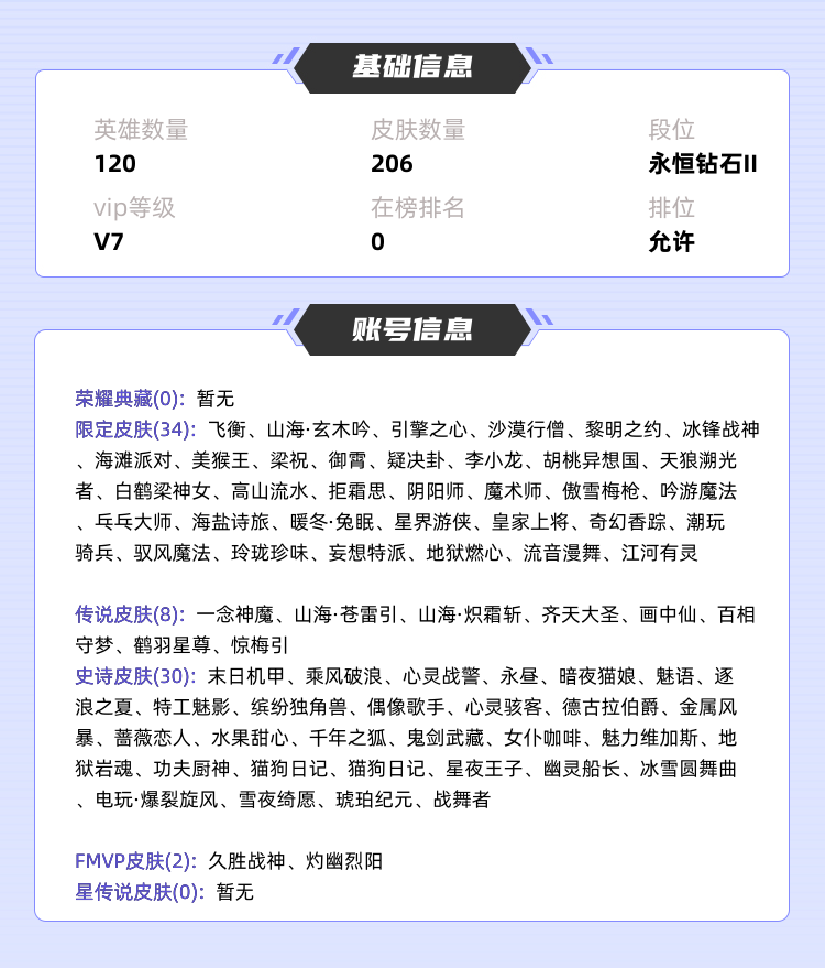 装备描述:>>>>>>毁号,涉及毁坏虚拟财产罪及计算机安全罪,请文明游戏素质游戏,让我们共建美好租号平台>>>>>> 本游戏账号: ,英雄多,皮肤多。FMVP皮肤2个,尽情享受FMVP皮肤带来的主角光环, 私人所属英雄皮肤有:李信 山海·炽霜斩||李信 一念神魔||诸葛亮 鹤羽星尊||孙悟空 齐天大圣||张飞 百相守梦||干将莫邪 画中仙||曜 山海·苍雷引||宫本武藏 惊梅引东皇太一 灼幽烈阳||干将莫邪 久胜战神,等等 注意事项: A.游戏过程中请不要恶意挂机或者不文明发言;B.恶意挂机、顶号等行为将被拉黑无法再次下单;C.进入游戏后中途请勿退出登陆,否则无法再次上号;D.部分账号由于异地登录可能会出现密码错误提示,通常再尝试5-6次后可上号。 |||||||||>喜欢本账号请点 ☆收藏☆ 方便下次租用,谢谢光临惠顾|||||||||喜欢本账号请点 ☆收藏☆ 方便下次租用,谢谢光临惠顾!