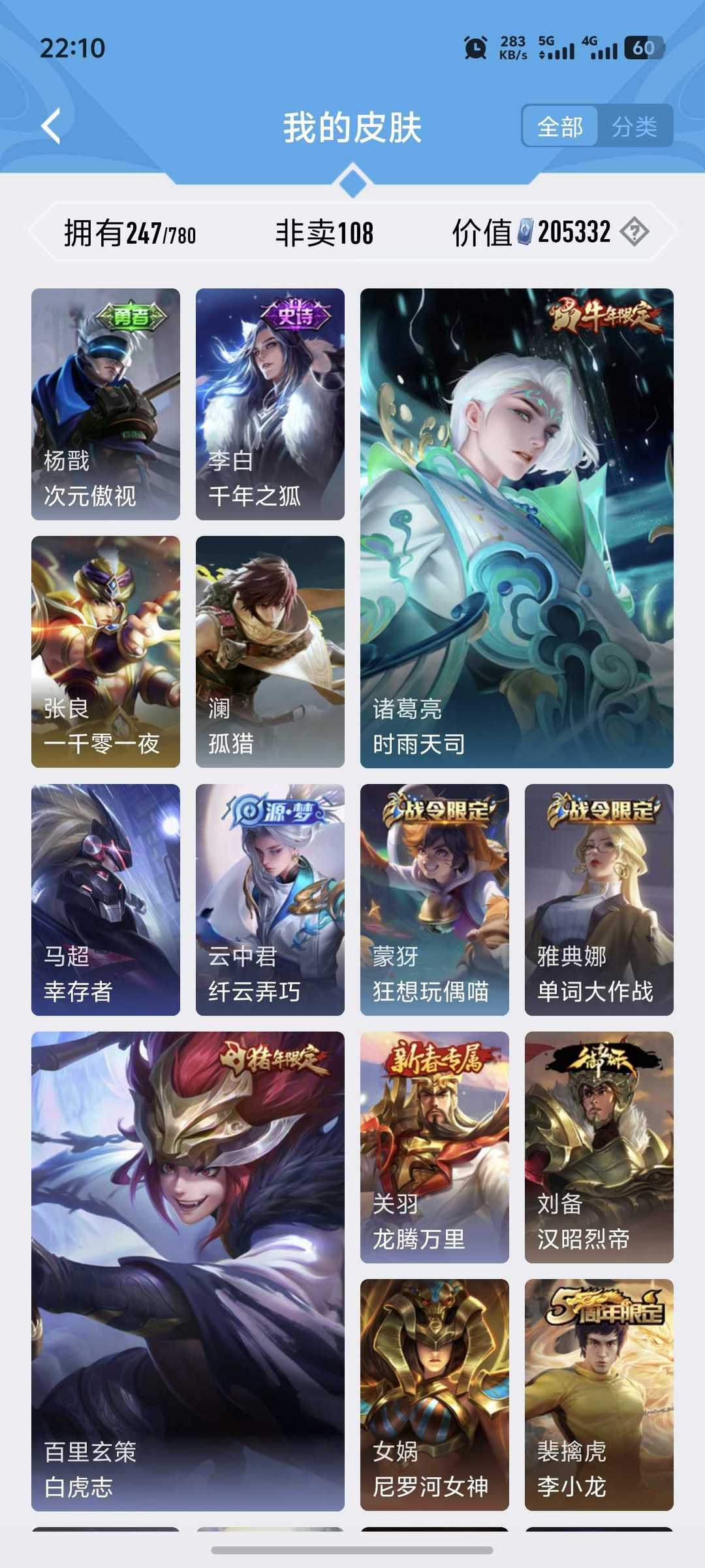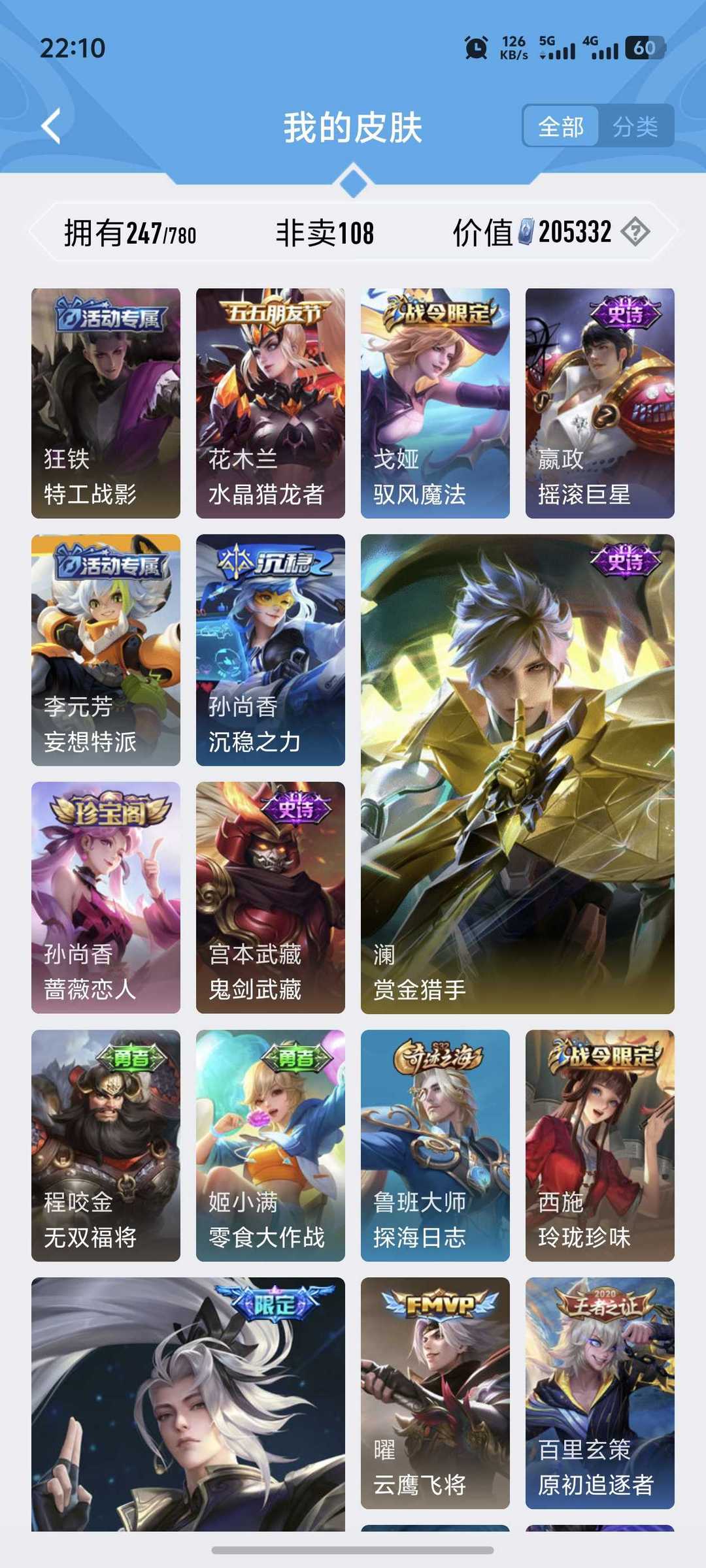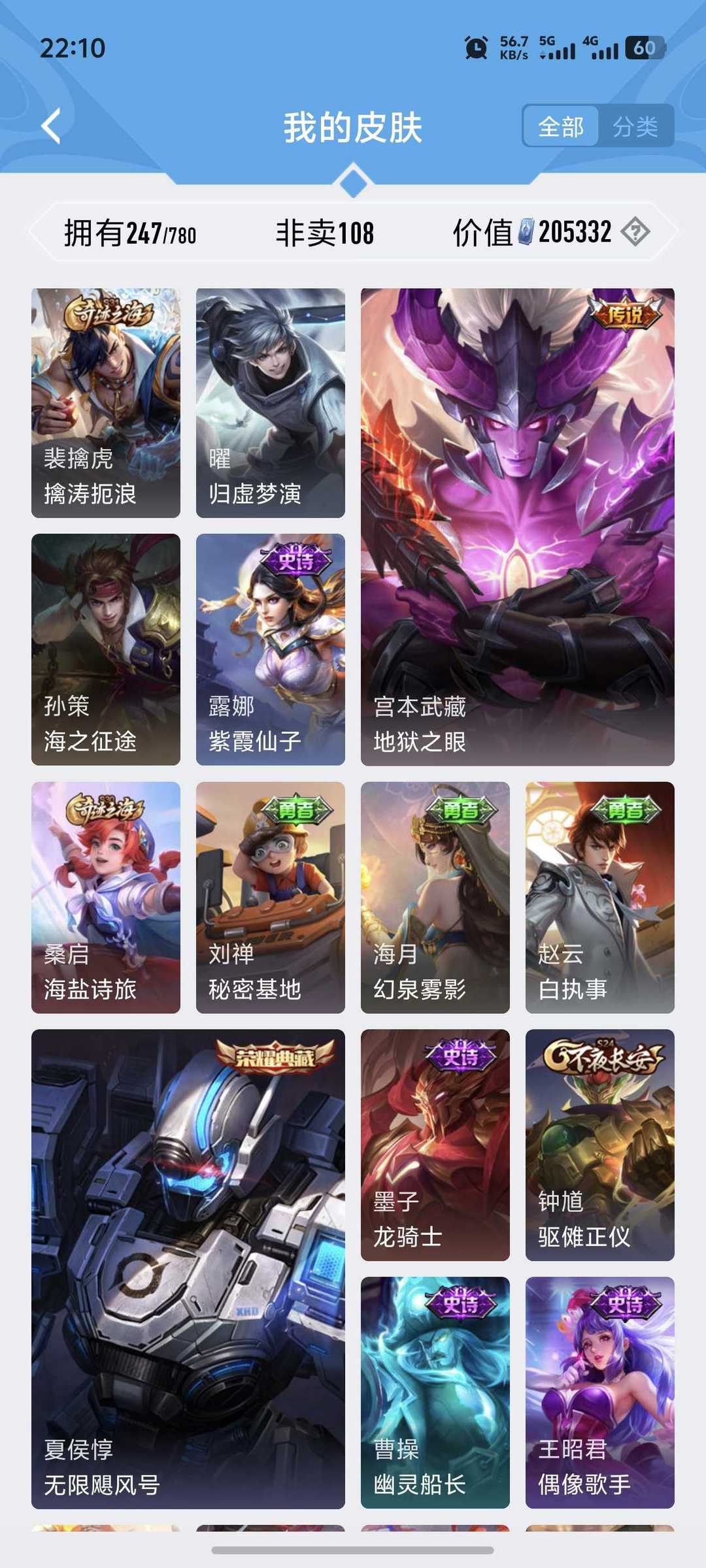 限制: 租号1次及以上 | 撤单率<85%才可租用此帐号装备描述:>>>>>>毁号,涉及毁坏虚拟财产罪及计算机安全罪,请文明游戏素质游戏,让我们共建美好租号平台>>>>>> 本游戏账号: ,英雄多,皮肤多。典藏皮肤1个,感受典藏皮肤带来的优质体验快感,FMVP皮肤3个,尽情享受FMVP皮肤带来的主角光环, 私人所属英雄皮肤有:夏侯惇 无限飓风号宫本武藏 地狱之眼||孙悟空 地狱火||桑启 鸣野蒿||狄仁杰 超时空战士||虞姬 启明星使西施 游龙清影||曜 云鹰飞将||吕布 怒海麟威,等等 注意事项: A.游戏过程中 怒海麟威不要恶意挂机或者不文明发言;B.恶意挂机、顶号等行为将被拉黑无法再次下单;C.进入游戏后中途请勿退出登陆,否则无法再次上号;D.部分账号由于异地登录可能会出现密码错误提示,通常再尝试5-6次后可上号。 |||||||||>喜欢本账号请点 ☆收藏☆ 方便下次租用,谢谢光临惠顾|||||||||