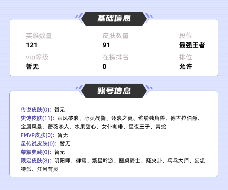 装备描述:>>>>>>毁号,涉及毁坏虚拟财产罪及计算机安全罪,请文明游戏素质游戏,让我们共建美好租号平台>>>>>> 本游戏账号: ,英雄多,皮肤多。 私人所属英雄皮肤有:蔡文姬 繁星吟游||盾山 圆桌骑士||鲁班大师 乓乓大师||李元芳 妄想特派||明世隐 疑决卦||狄仁杰 阴阳师||米莱狄 御霄||阿古朵 江河有灵小乔 缤纷独角兽||小乔 青蛇||亚瑟 心灵战警||孙尚香 蔷薇恋人||孙尚香 水果甜心||妲己 女仆咖啡||李元芳 逐浪之夏||白起 星夜王子||墨子 金属风暴||刘邦 德古拉伯爵||夏侯惇 乘风破浪,等等 注意事项: A.游戏过程中请不要恶意挂机或者不文明发言;B.恶意挂机、顶号等行为将被拉黑无法再次下单;C.进入游戏后中途请勿退出登陆,否则无法再次上号;D.部分账号由于异地登录可能会出现密码错误提示,通常再尝试5-6次后可上号。 |||||||||>喜欢本账号请点 ☆收藏☆ 方便下次租用,谢谢光临惠顾|||||||||
