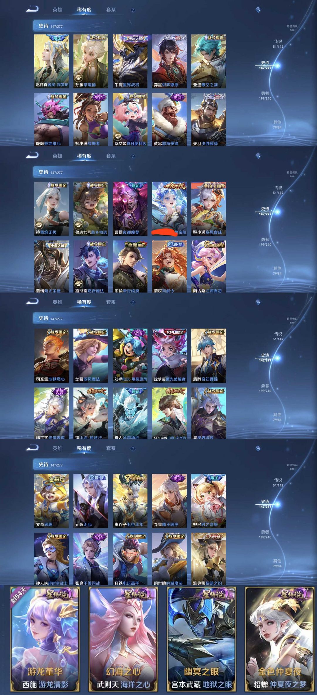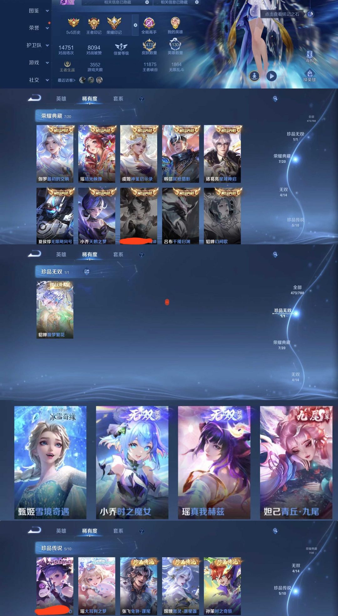 限制: 撤单率<49%才可租用此帐号装备描述:时间到了还登录白玩或者顶号全部改密拉黑处理永不解除,顶号机器会秒禁玩改密,顶号不仅拉黑还没得玩,赚三两块不容易,请理解谢谢。 ❤❤❤❤❤❤❤❤❤❤❤❤❤❤❤ 请勿开挂,挂机,送头,骂人,撤单后游戏等如有违规永久拉黑永不解除。重置二级密码不要费劲了,号主每天都会上号查看,多行不义必自毙,人在做天在看,多做好事多自律,少做缺德事。 该号英雄130个皮肤473个,珍品无双1个,典藏8个,无双4个,珍品传说5个,星传说4个,传说31个,史诗147个,祝你游戏愉快~