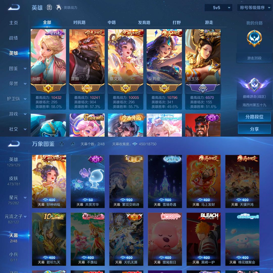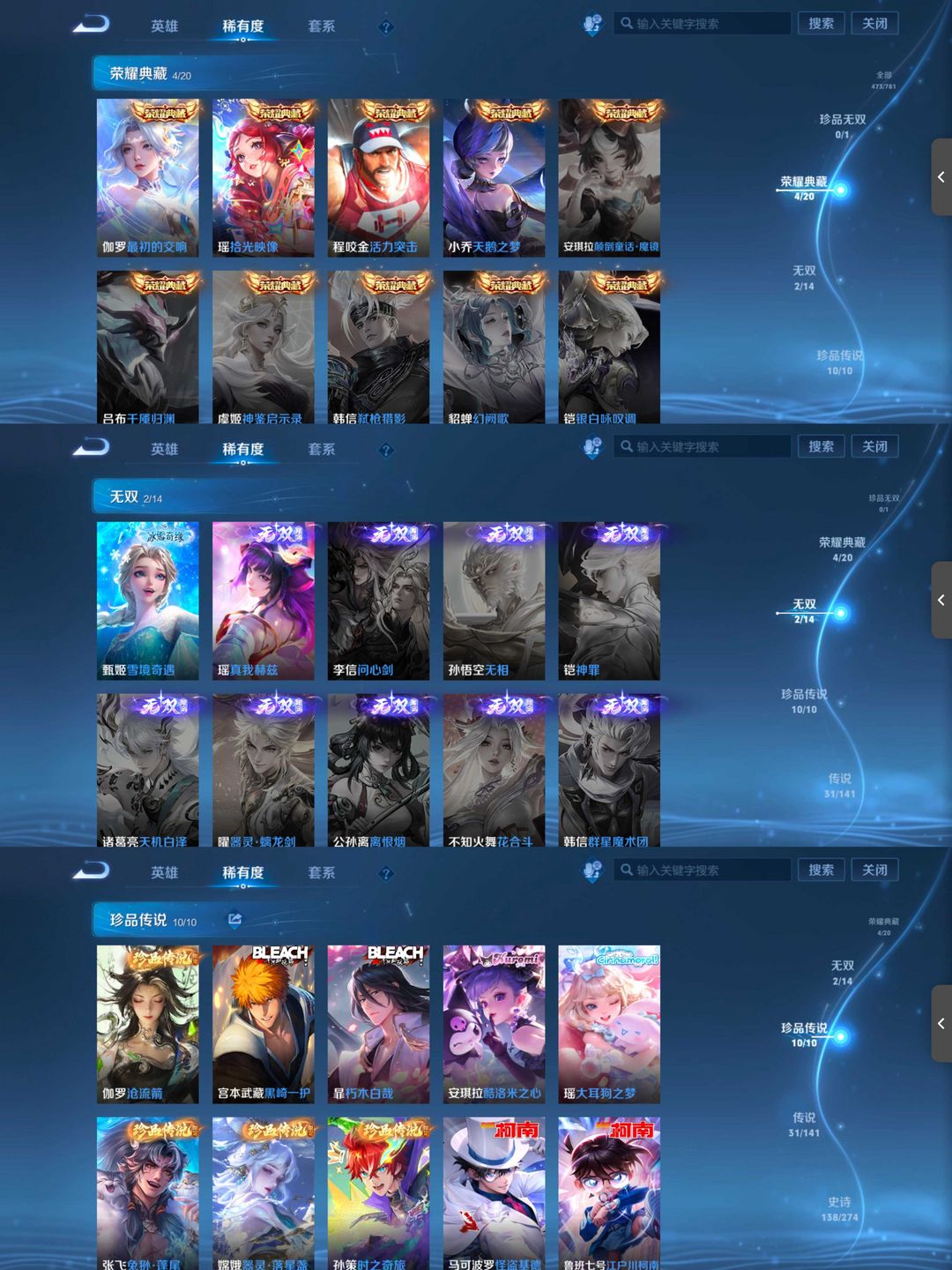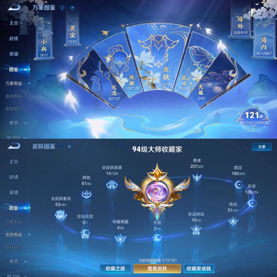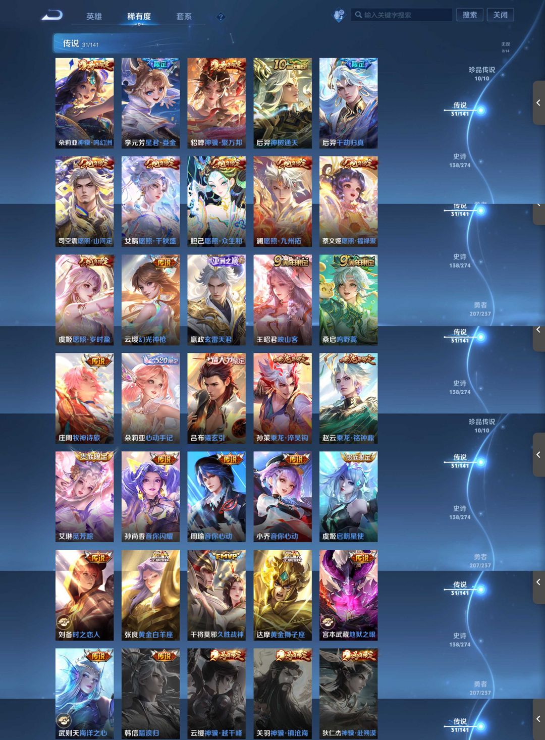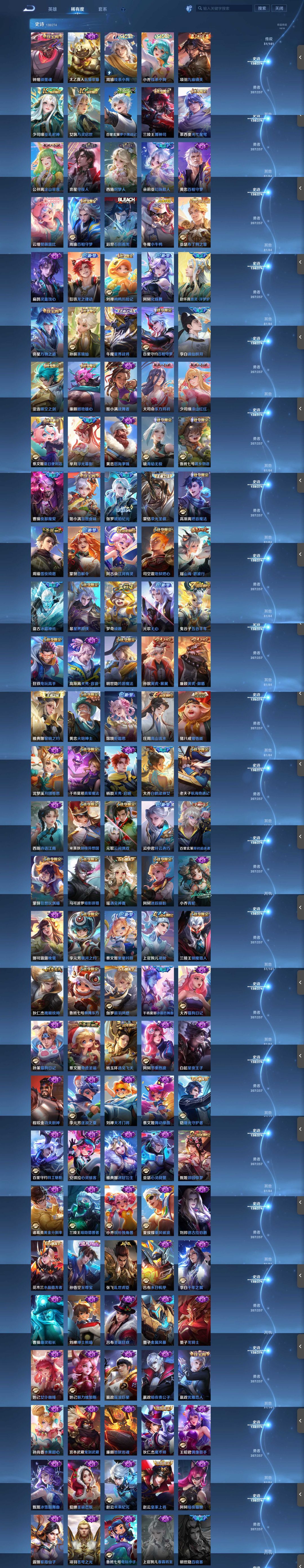 贵族10,4历史万战,4典藏,2无双,10珍品传说,31传说,138史诗,180限定,1传说天幕