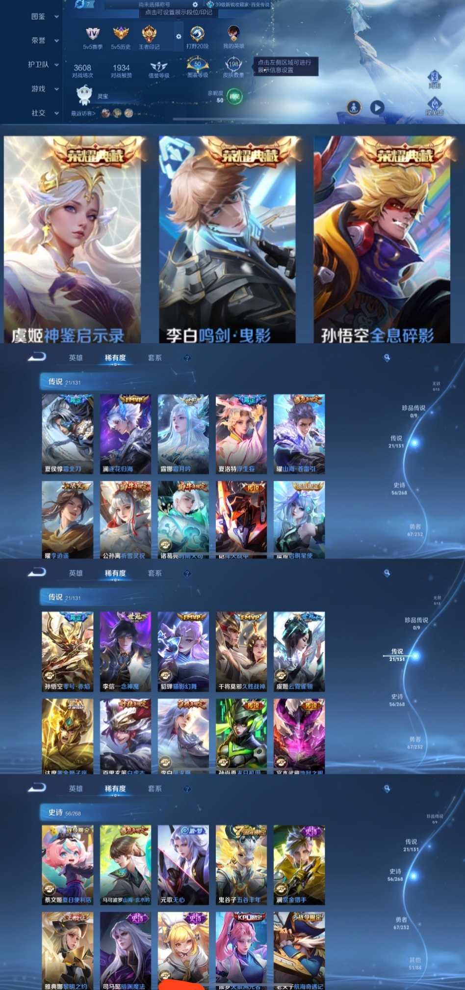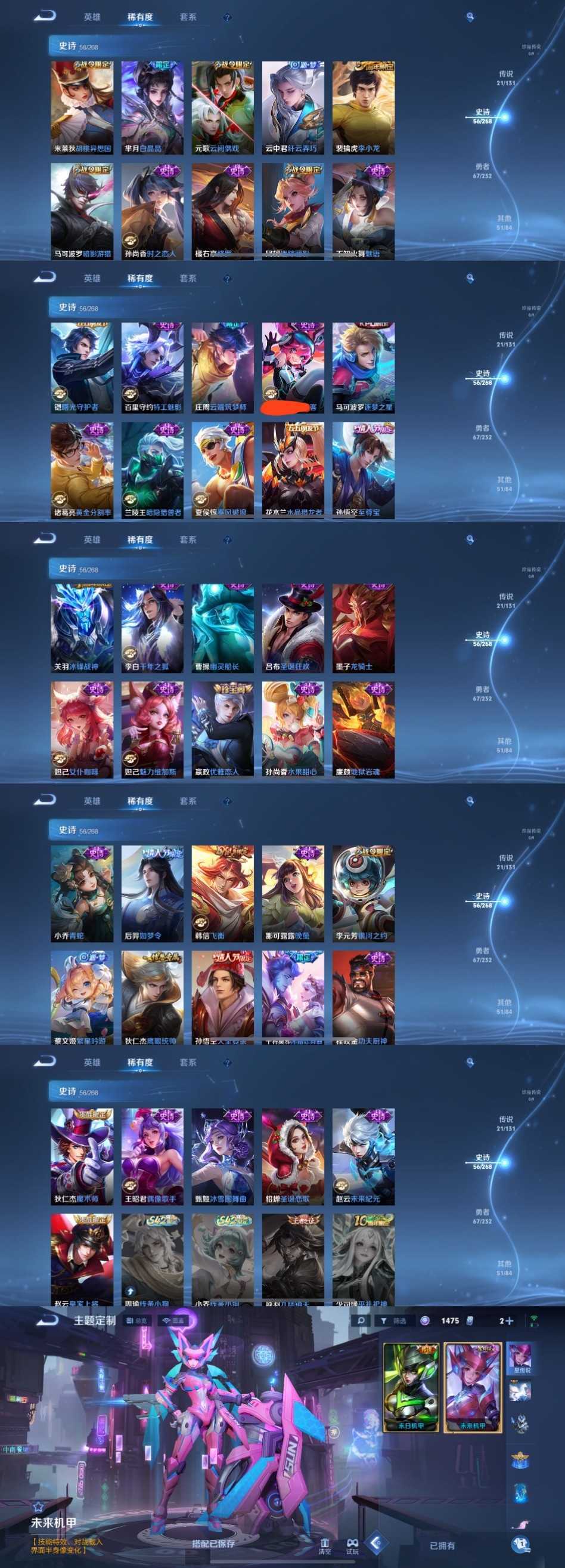 限制: 撤单率<49%才可租用此帐号装备描述:时间到了还登录白玩或者顶号全部改密拉黑处理永不解除,顶号机器会秒禁玩改密,顶号不仅拉黑还没得玩,赚三两块不容易,请理解谢谢。 ❤❤❤❤❤❤❤❤❤❤❤❤❤❤❤❤❤❤❤ 请勿开挂,挂机,送头,骂人,撤单后游戏等如有违规永久拉黑永不解除。 重置二级密码不要费劲了,号主每天都会上号查看,多行不义必自毙,人在做天在看,多做好事多自律,少做缺德事。 该号英雄127个皮肤198个,典藏2个,传说21个,史诗56个,祝您游戏愉快~