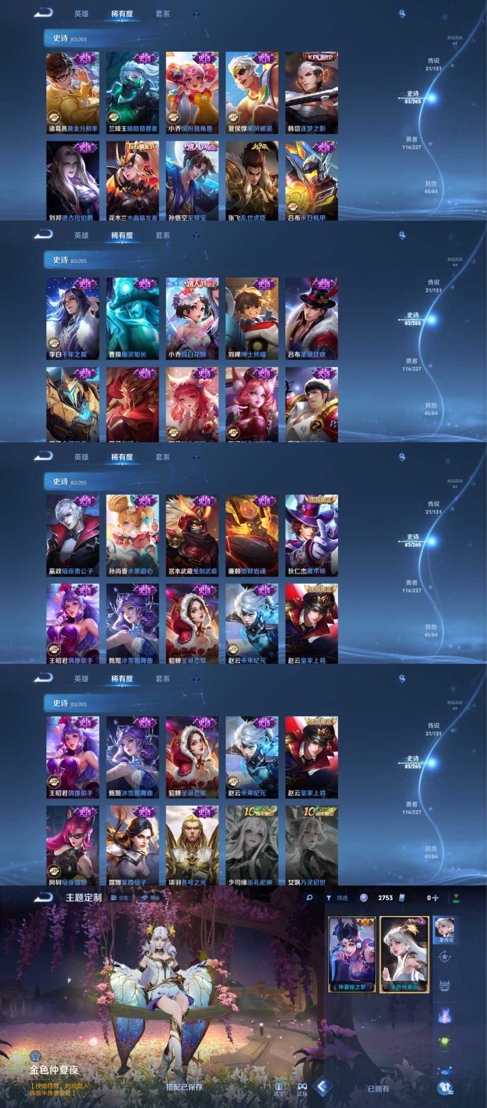 限制: 租号2次及以上 | 撤单率<49%才可租用此帐号装备描述:时间到了还登录白玩或者顶号全部改密拉黑处理永不解除,顶号机器会秒禁玩改密,顶号不仅拉黑还没得玩,赚三两块不容易,请理解谢谢。 ❤❤❤❤❤❤❤❤❤❤❤❤❤❤❤ 请勿开挂,挂机,送头,骂人,撤单后游戏等如有违规永久拉黑永不解除。 重置二级密码不要费劲了,号主每天都会上号查看,多行不义必自毙,人在做天在看,多做好事多自律,少做缺德事。 该号英雄127个皮肤267个,典藏1个,无双1个,星传说1个,传说21个,史诗83个,祝你游戏愉快~