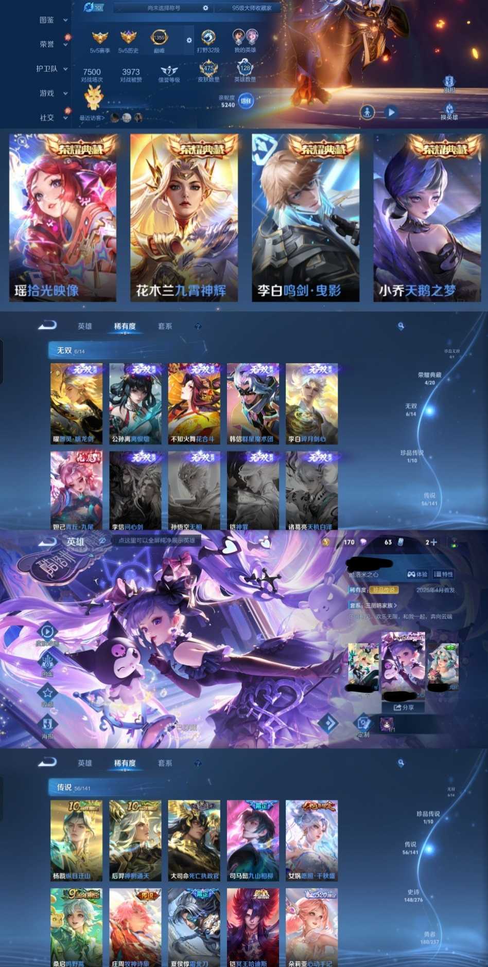 限制: 租号2次及以上 | 撤单率<49%才可租用此帐号装备描述:时间到了还登录白玩或者顶号全部改密拉黑处理永不解除,顶号机器会秒禁玩改密,顶号不仅拉黑还没得玩,赚三两块不容易,请理解谢谢。 ❤❤❤❤❤❤❤❤❤❤❤❤❤❤❤ 请勿开挂,挂机,送头,骂人,撤单后游戏等如有违规永久拉黑永不解除。 重置二级密码不要费劲了,号主每天都会上号查看,多行不义必自毙,人在做天在看,多做好事多自律,少做缺德事。 该号英雄128个皮肤475个,典藏4个,无双6个,珍品传说1个,星传说2个,传说56个,史诗148个,祝你游戏愉快~