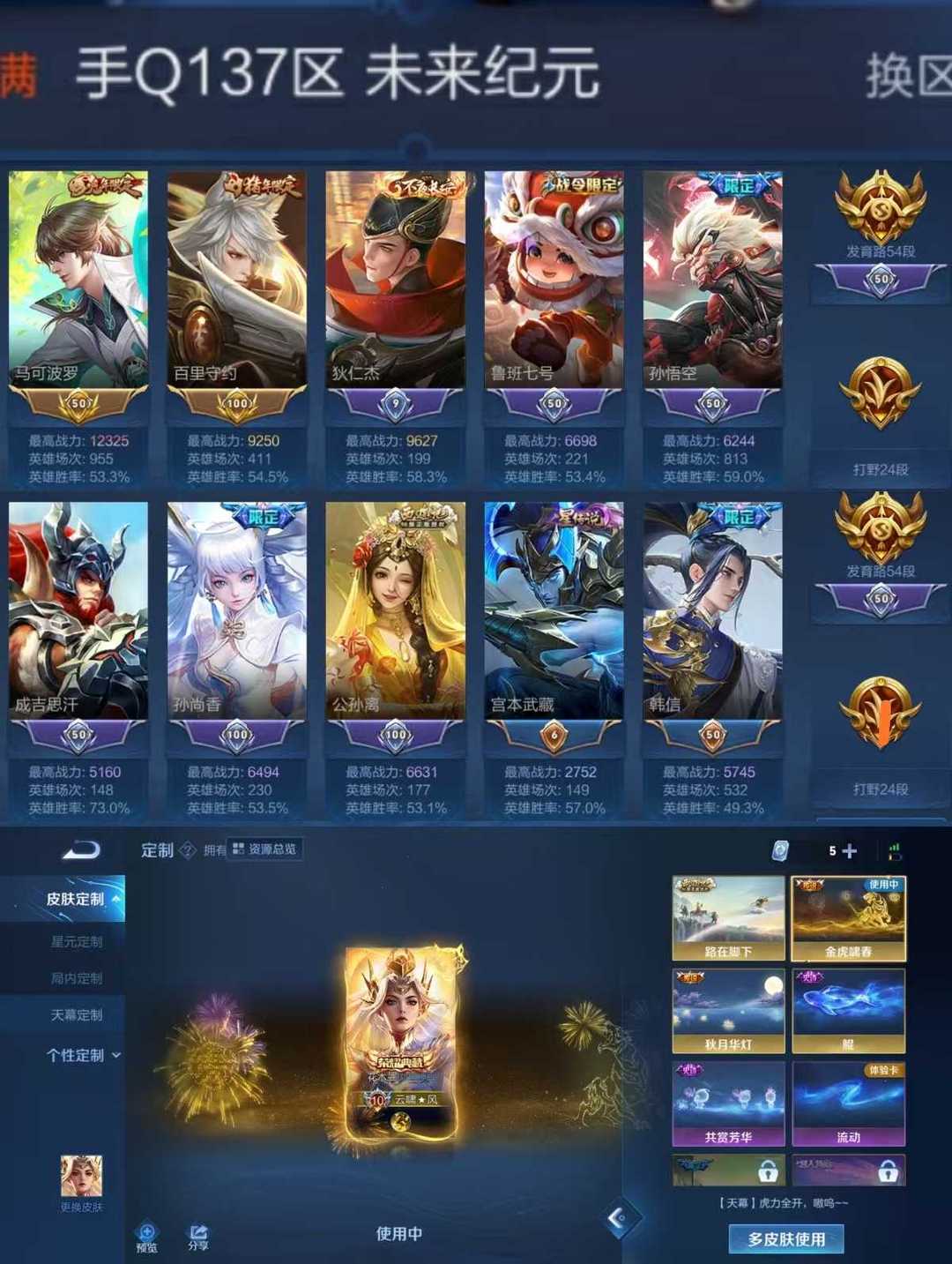 限制: 租号5次及以上 |装备描述:【C53】贵族V10~470皮5典藏49传说九霄神辉,倪克斯神谕,鸣剑曳影,全息碎影【优质限定皮肤】:山海·苍雷引,山海·炽霜斩,瑶时之祈愿,云中君时之祈愿,祈雪灵祝,白虎志,武圣,神威,梅西,天魔缭乱,凤求凰,至尊宝