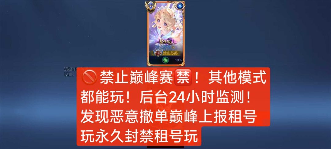 限制: 租号2次及以上 | 撤单率<65%才可租用此帐号装备描述:禁止利用账号进行开挂、使用辅助违规软件诈骗等违规操作。喜欢本账号请点 ☆收藏☆ 方便下次租用,谢谢光临惠顾!毁号行为涉及毁坏虚拟财产罪及计算机安全罪,请文明游戏素质游戏,让我们共建美好租号平台!请游戏局内保持文明,防止禁言影响他人游戏,祝您玩得愉快!