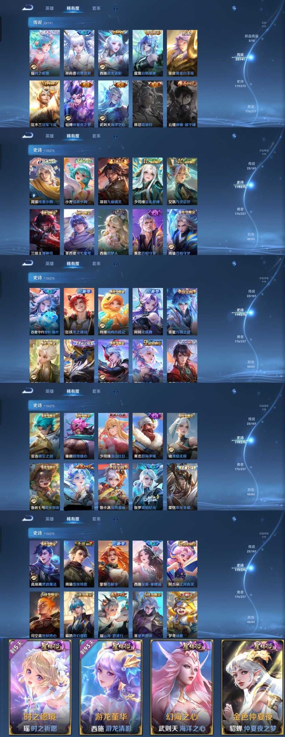 限制: 撤单率<49%才可租用此帐号装备描述:时间到了还登录白玩或者顶号全部改密拉黑处理永不解除,顶号机器会秒禁玩改密,顶号不仅拉黑还没得玩,赚三两块不容易,请理解谢谢。 ❤❤❤❤❤❤❤❤❤❤❤❤❤❤❤❤❤❤❤ 请勿开挂,挂机,送头,骂人,撤单后游戏等如有违规永久拉黑永不解除。 重置二级密码不要费劲了,号主每天都会上号查看,多行不义必自毙,人在做天在看,多做好事多自律,少做缺德事。 该号英雄128个皮肤365个,典藏2个,无双1个,珍品传说1个,星传说2个,传说23个,史诗119个,祝您游戏愉快~