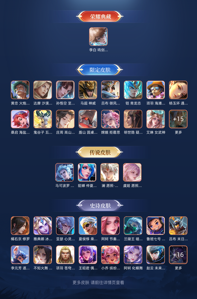 马可波罗,深海之息/貂蝉,仲夏夜之梦/孙悟空,至尊宝/马超,神威/澜,李白荣耀典藏