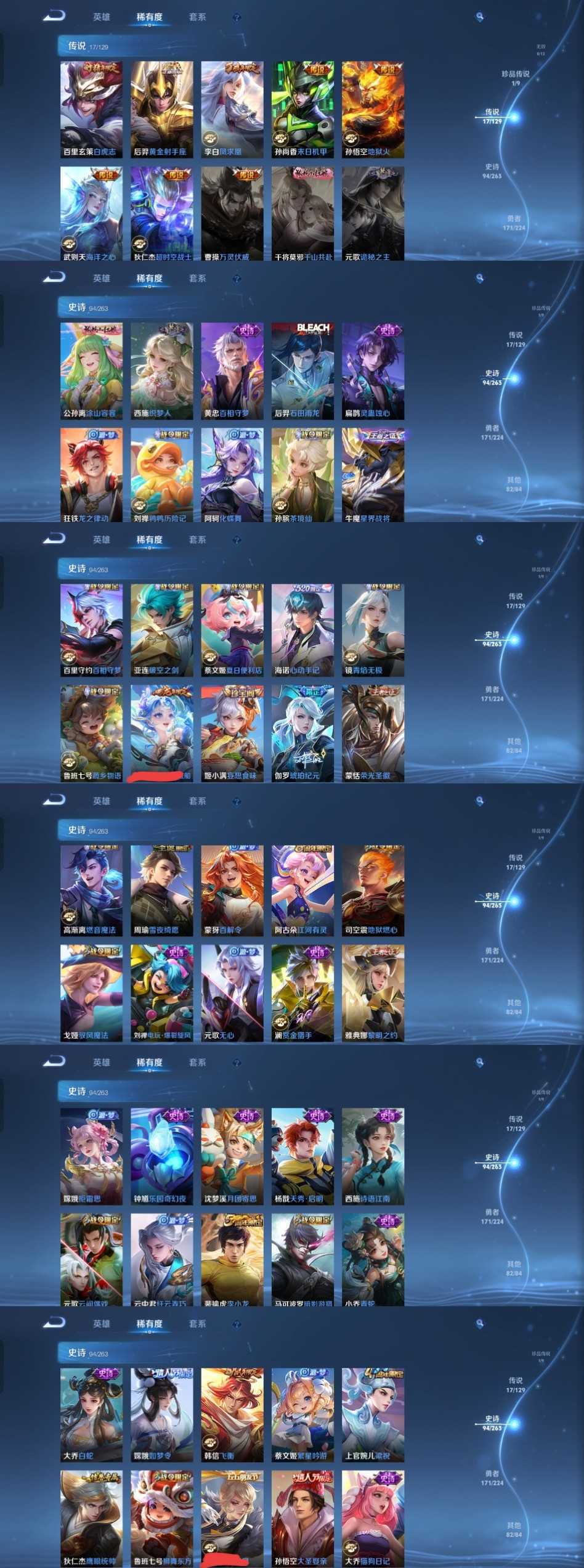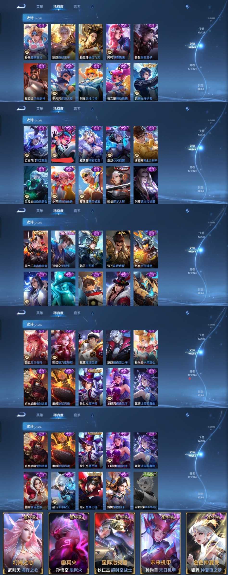 限制: 租号1次及以上 | 撤单率<49%才可租用此帐号装备描述:时间到了还登录白玩或者顶号全部改密拉黑处理永不解除,顶号机器会秒禁玩改密,顶号不仅拉黑还没得玩,赚三两块不容易,请理解谢谢。 ❤❤❤❤❤❤❤❤❤❤❤❤❤❤❤ 请勿开挂,挂机,送头,骂人,撤单后游戏等如有违规永久拉黑永不解除。 重置二级密码不要费劲了,号主每天都会上号查看,多行不义必自毙,人在做天在看,多做好事多自律,少做缺德事。 该号英雄128个皮肤369个,典藏5个,珍品传说1个,星传说5个,传说17个,史诗94个,祝你游戏愉快~