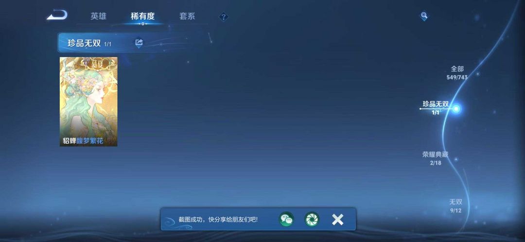 装备描述:V10无双贵族✨549皮肤✨9无双✨9珍品传说✨馥梦繁花✨94传说✨蛇年限定套装