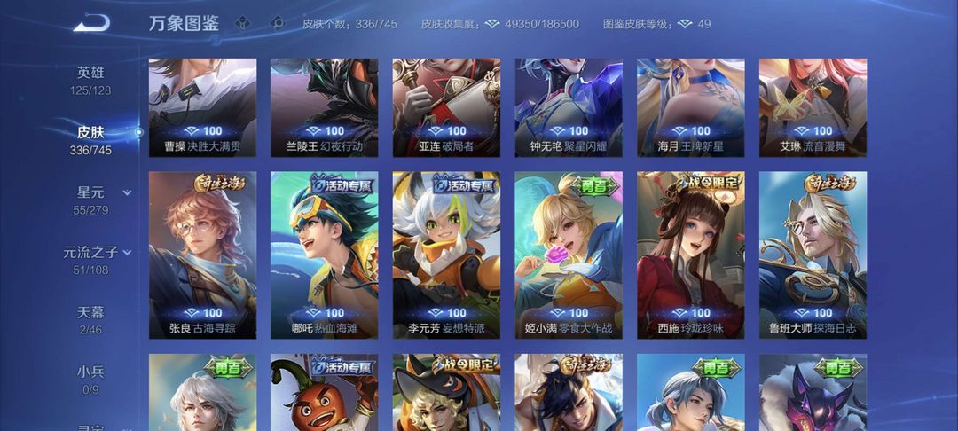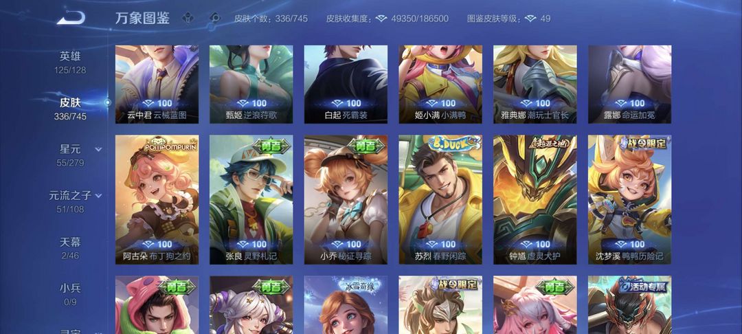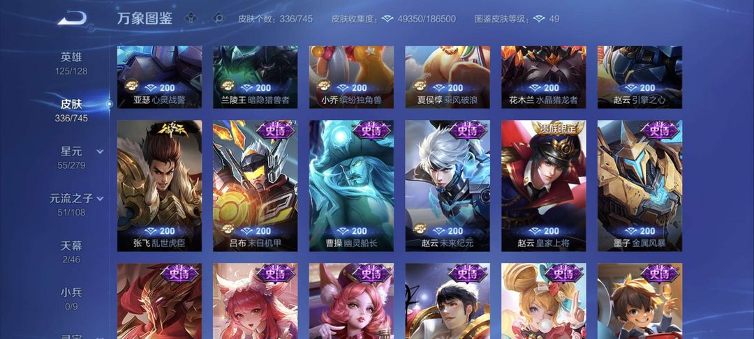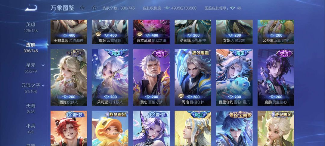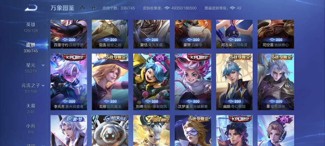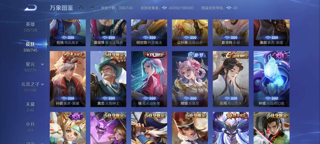 336皮肤极品v8账号李白夏侯双典藏•怪盗基德•蛇年年限全套•廉颇 孙膑 耀 李信年限•匿光小队全套